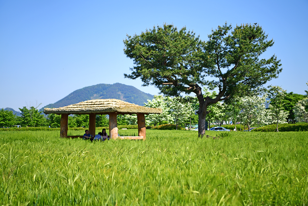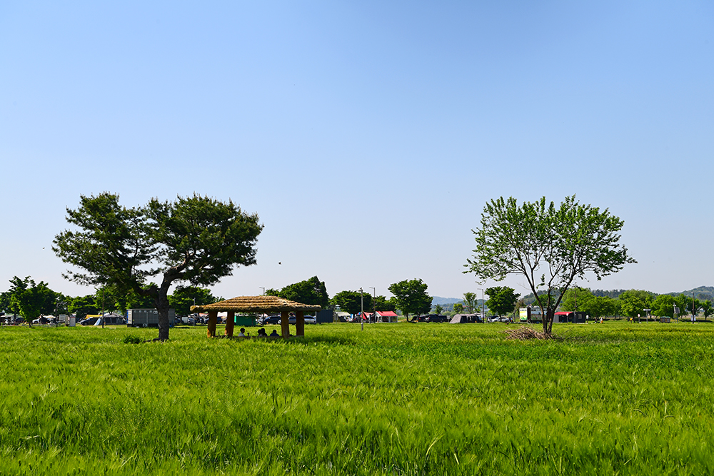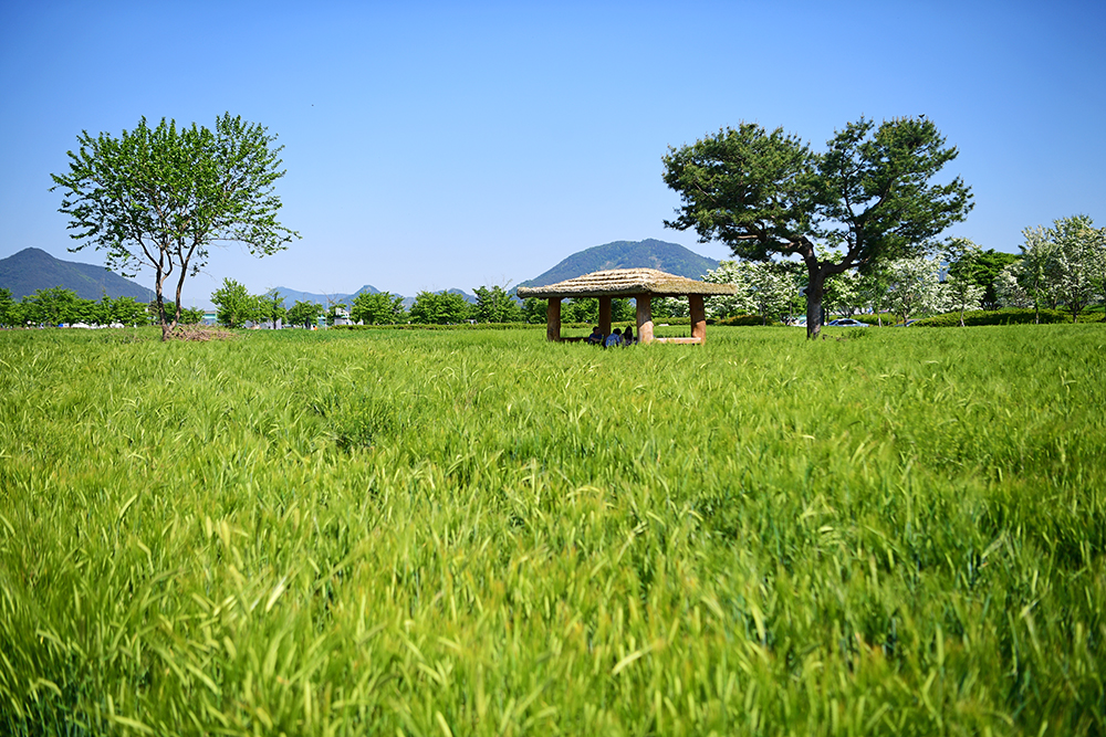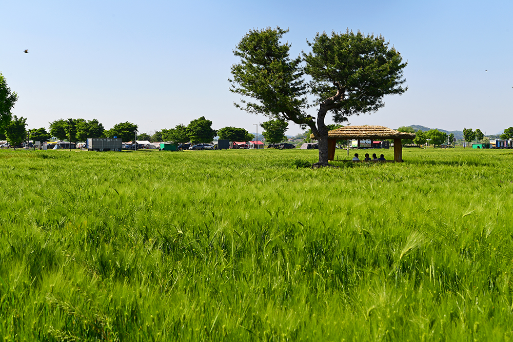 청보리 밭의 전경을 쓰윽 들러본 후, 지난해 봐뒀던 정자로 향했습니다. 정자 옆 큰 나무와 주변 풍경이 예쁘게 어우러진 곳입니다. 정겹운 정자와 어우러진 청보리밭의 모습을 살포시 담아 봅니다