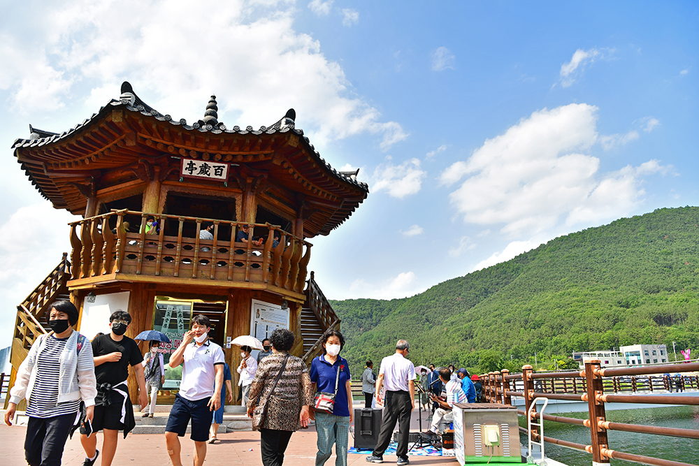다리를 건너 도착한 곳은 ‘백세정’입니다. 저수지 한 가운데 있는 정자입니다. 정자 주변에서 흥겨운 노래소리가 들려옵니다. 나이가 지긋한 분들의 버스킹인데 아주 흥겹습니다. ㅎㅎ