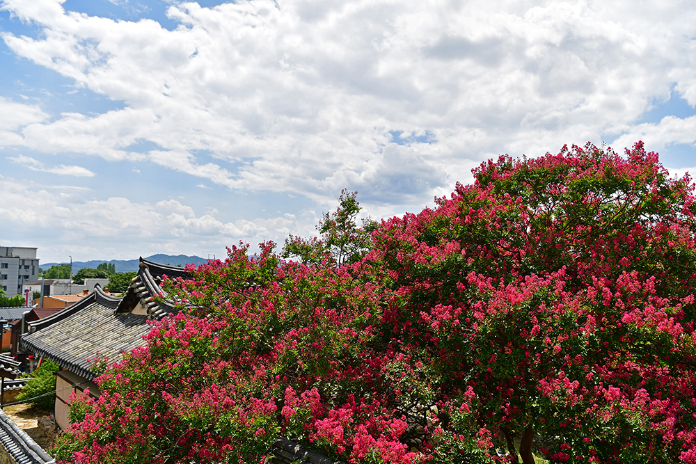 주차장은 협소합니다. 어쩔수없이 주변 식당 거리 변에 주차하고 입구에 도착하니, 지붕 위로 붉게 피어있는 배롱나무가 눈길을 사로잡습니다. ㅎ
