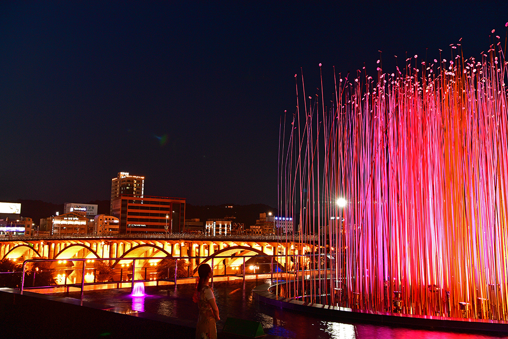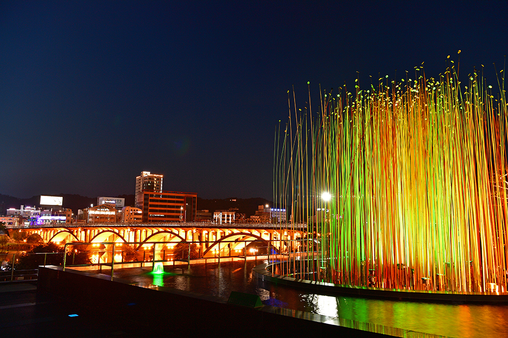 대나무 숲길을 빠져 나오니 휘황찬란(?)한 불빛 분수가 반겨 줍니다. 멋진 불빛으로 물든 진주교의 야경이 더해져 아름다운 모습의 불빛 분수를 담아 봅니다~~^^