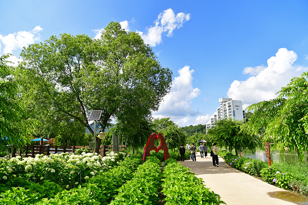 유구교 앞에서부터 '유구색동수국정원'이 시작됩니다. 정원부터 즐길지 아니면 둑길 부터 즐길지 살펴 봅니다. 찬찬히 살펴보니 둑길에 조성된 산책로를 중심으로 수국이 제법 많이 피었습니다. 그쪽으로 방문객도 많습니다.