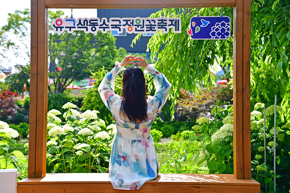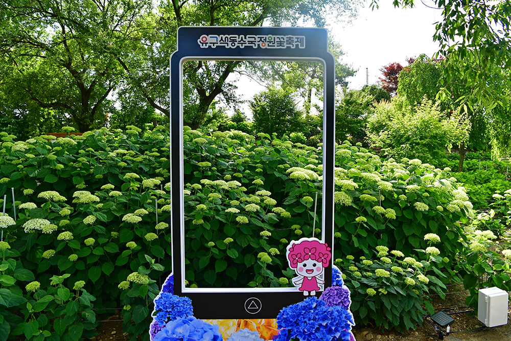 정원에는 아름다운 수국과 함께 인생샷을 담을 수 있는 포토존이 곳곳에 설치되어 있습니다. 수국이 만개하면 더 멋진 인생샷을 담을 것 같습니다. ㅎ