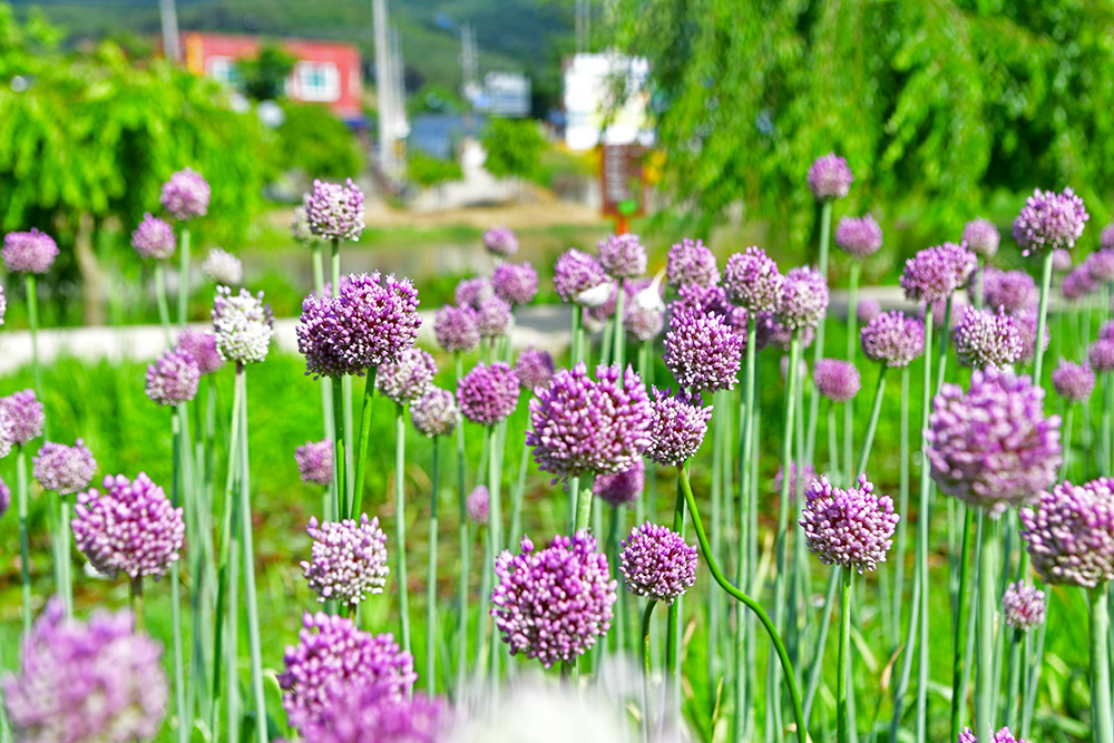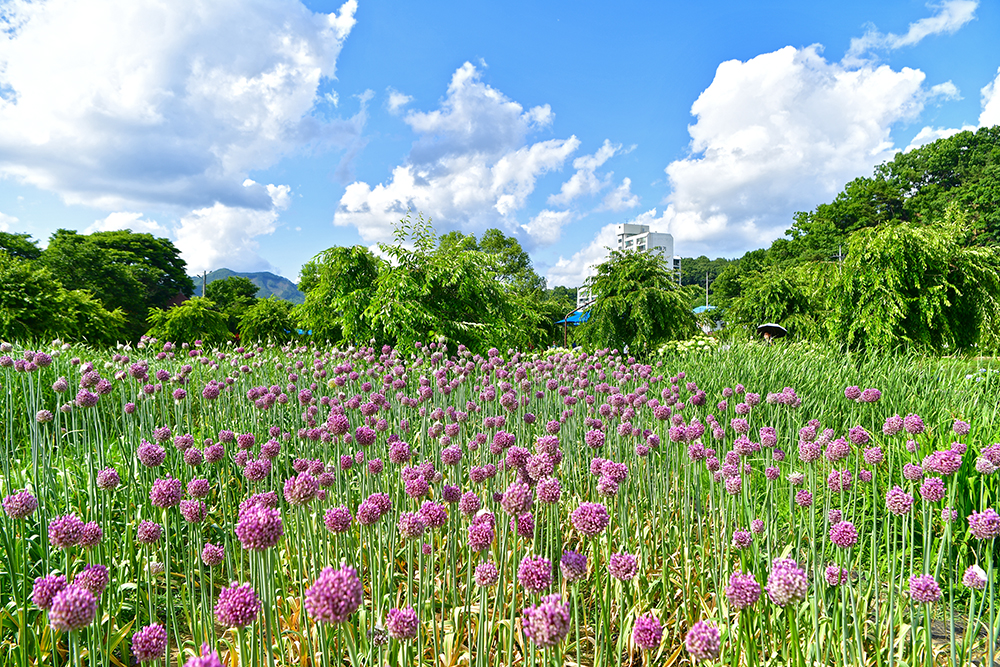 유마교에 도착하니 각종 부스가 있습니다. 이제 유구천변으로 내려가 유구색동수국정원을 즐길 요량입니다. 수국을 기대하며 내려갔는데, 어디선가 마늘냄새가 쎄합니다. 뭐지 살펴보니 보라빛이 아름다운 코끼리마늘꽃 군락지가 있습니다. 이제 막 피어나는 코끼리마늘꽃부터 즐겨 봅니다. ㅎㅎ