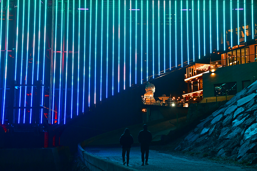 미디어 파사드 아래를 지나가는 방문객의 모습을 담아봅니다. 시시각각 변하는 조명빛에 따라 독특한 분위기가 느껴집니다. ㅎㅎ