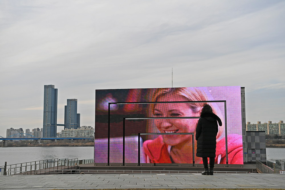 세빛섬을 둘러 본 후 예빛섬으로 왔습니다. 다양한 영상콘텐츠를 즐길 수 있는 미디어아트 갤러리 공간이라고 하는데요, 때마침 미디어아트 월 앞에 서있는 여인의 모습이 인상적입니다. 다양한 공연과 이벤트가 함께 열리는 곳 같습니다.