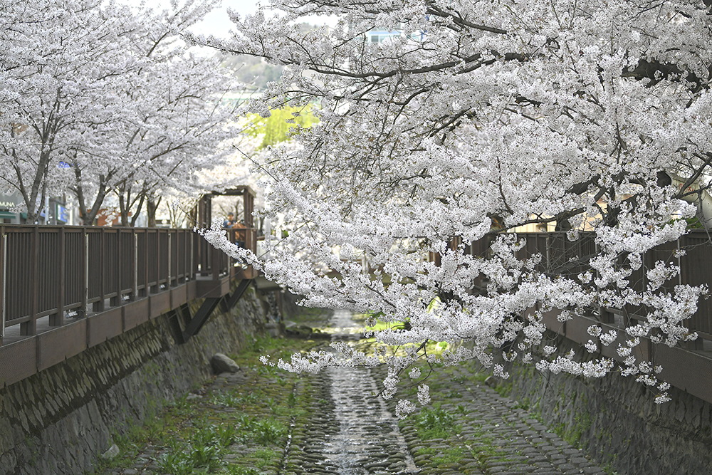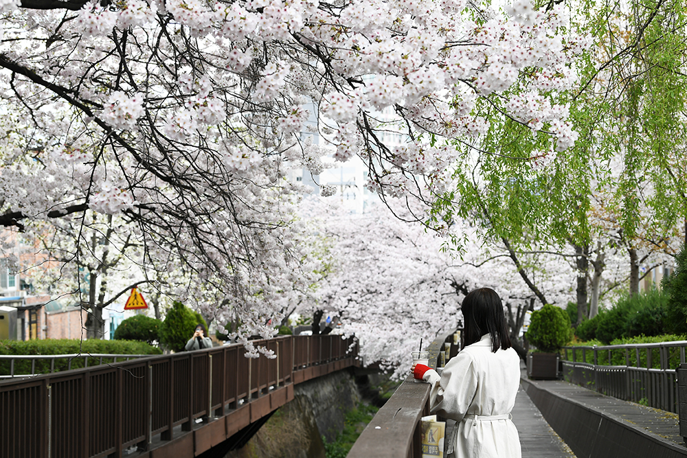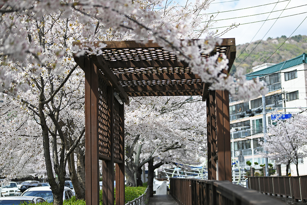 데크로드를 따라 벚꽃길을 걸어 봅니다. 벚꽃과 함께 걷다보면, 왠지 낮익다는 생각이 듭니다. 하천은 뒤덮은 벚꽃 모습이 진해 벚꽃명소인 여좌천을 꼭 빼닮은 것 같습니다. 왠지 '마산판 로망스다리'라고 해도 틀리지 않을 것 같습니다...ㅎㅎ