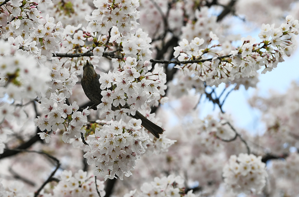 어디선가 새 한마리가 날아와 벚꽃 나무에 앉습니다. 생김새가 직박구리 같습니다. 호기심에 그 녀석의 모습도 담아봤습니다...ㅎ