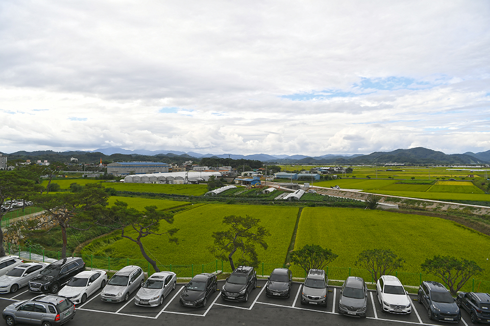 주차 후 임시 주차장 바로 앞에 있는 작은 동산에 올라 주변을 살펴봤습니다. 카페 앞 주차장에 있는 아름드리 소나무와 누렇게 익어가는 들판의 모습이 풍요롭게 보입니다. 한적한 시골 마을이 실감나는 모습입니다...ㅎ
