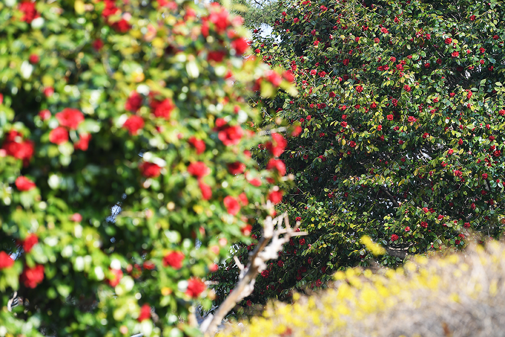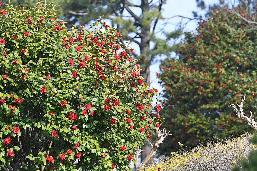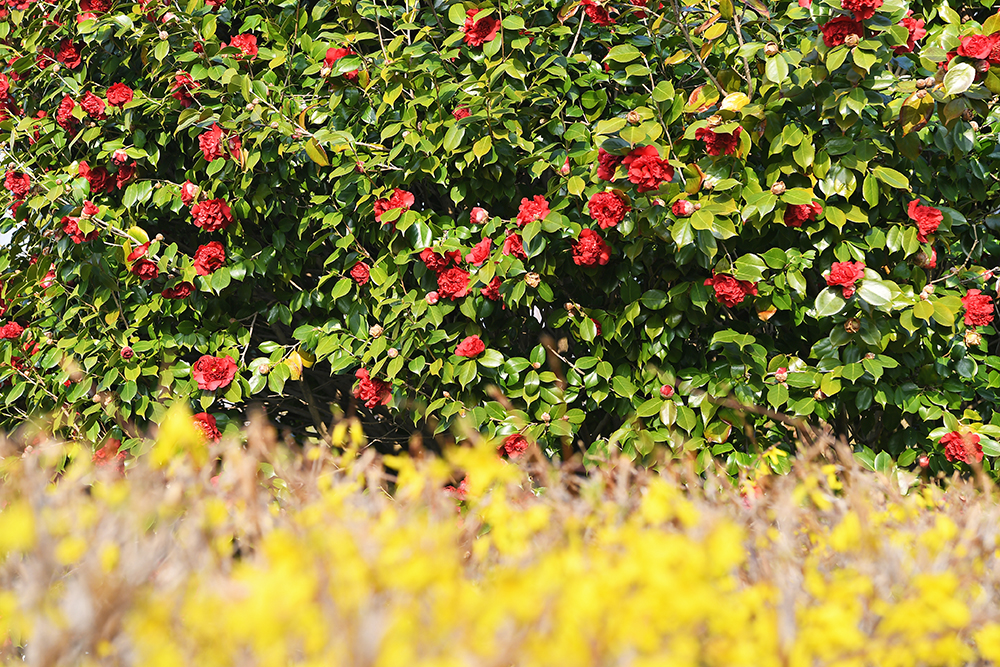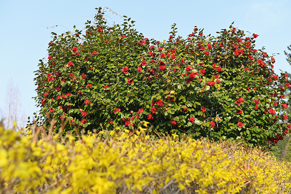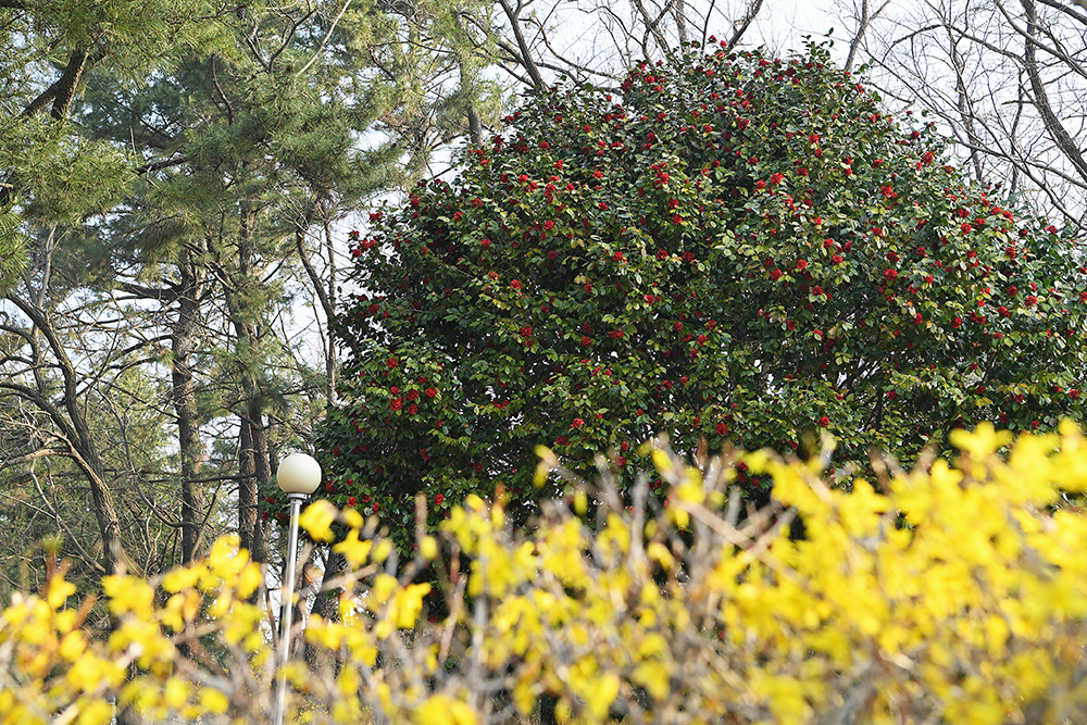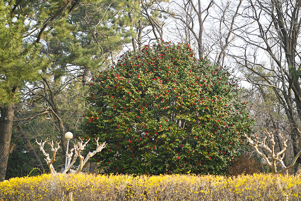 입구부터 큰 동백나무가 멋진 모습을 뽐냅니다. 붉은 동백꽃과 노란 개나리가 어우러지는 모습이 완전 예쁩니다. 그냥 갈 수 없습니다. 당연히 이 아이들의 아름다움을 즐겨야만 했습니다. ^^