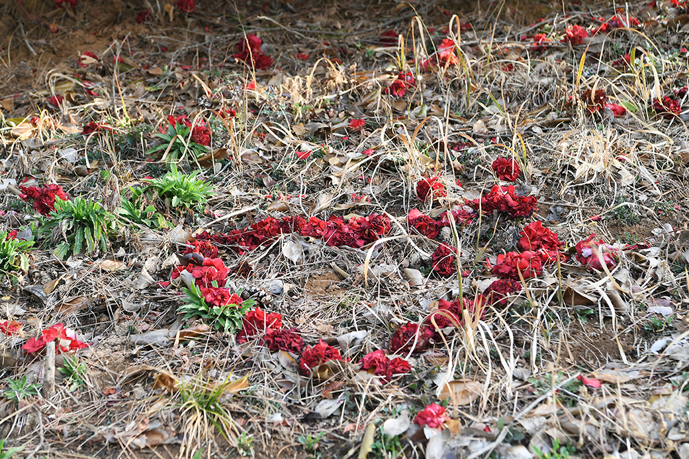 누군가 떨어진 동백꽃으로 하트 모양을 만들었습니다. 참 예쁘네요^^ 그런데 너무 만개한 탓일까요? 다른 곳에 비해 동백꽃이 훨씬 큰편입니다. 그래도 아름다움은 여전합니다^^