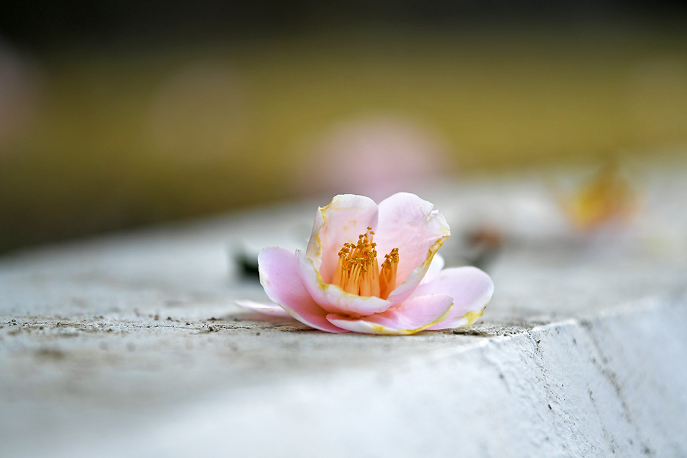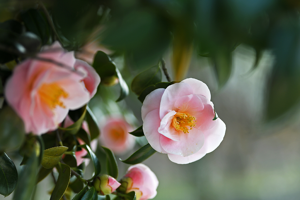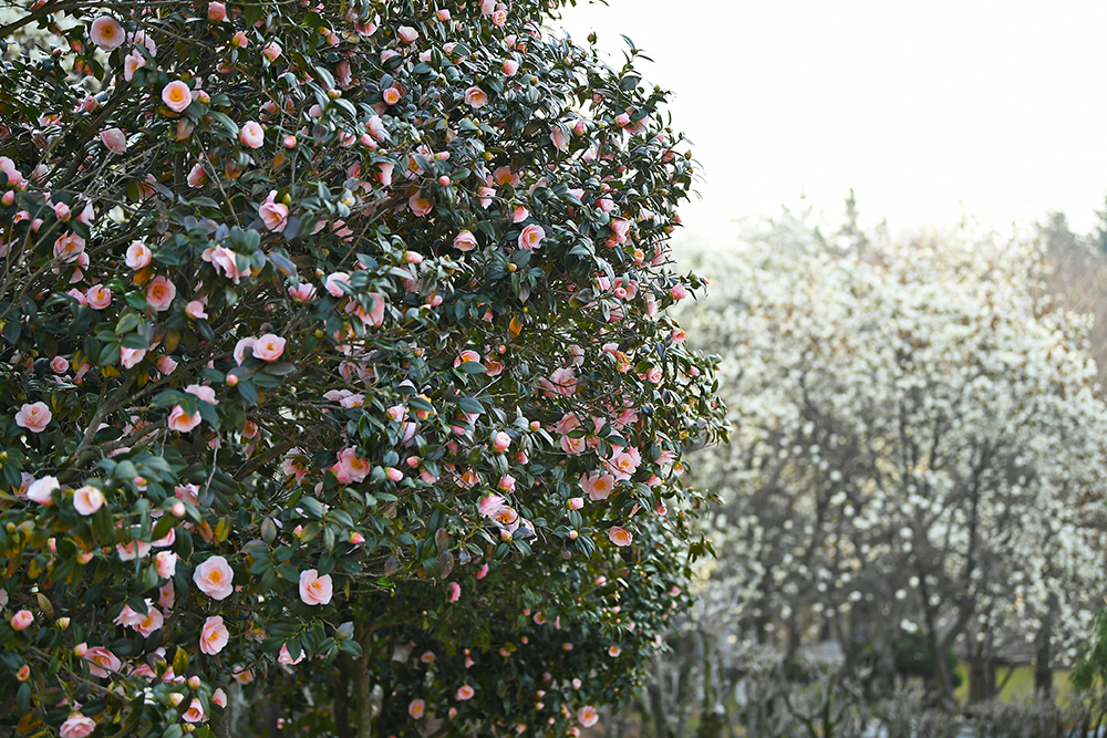 목련꽃 군락 옆에 연분홍빛 동백꽃이 피어있습니다. 오랜만에 만나는 연분홍 동백꽃입니다. 낙화한 모습도, 나무에 달려있는 모습도 너무 아름답습니다~