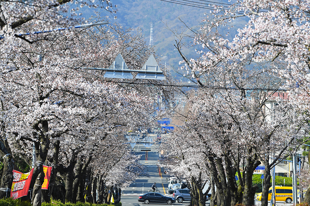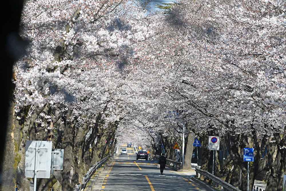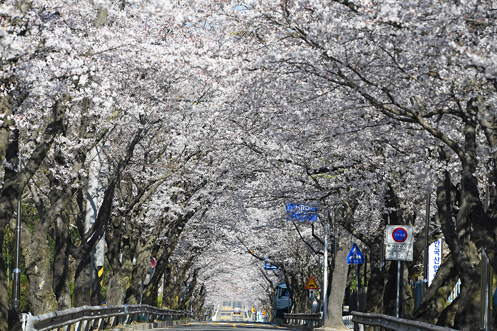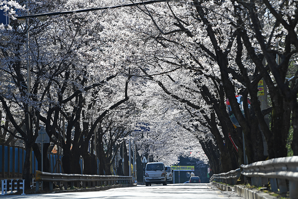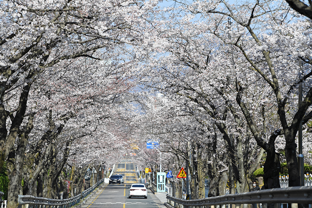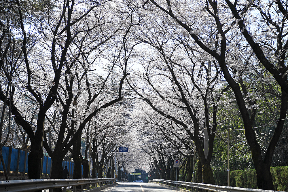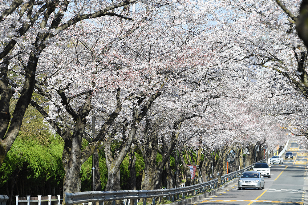 먼저 오가는 차량들을 피해 도로 중앙에서 창원 충혼탑 방향으로 벚꽃 터널을 담아봤습니다.