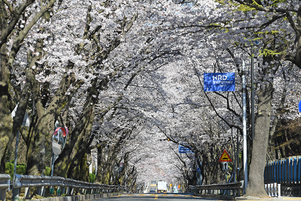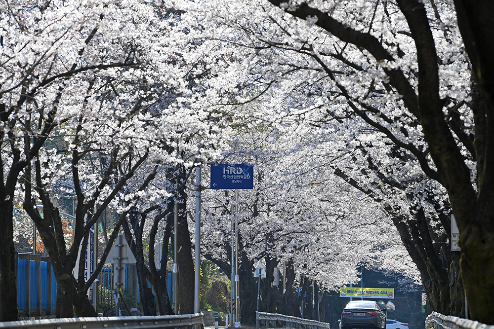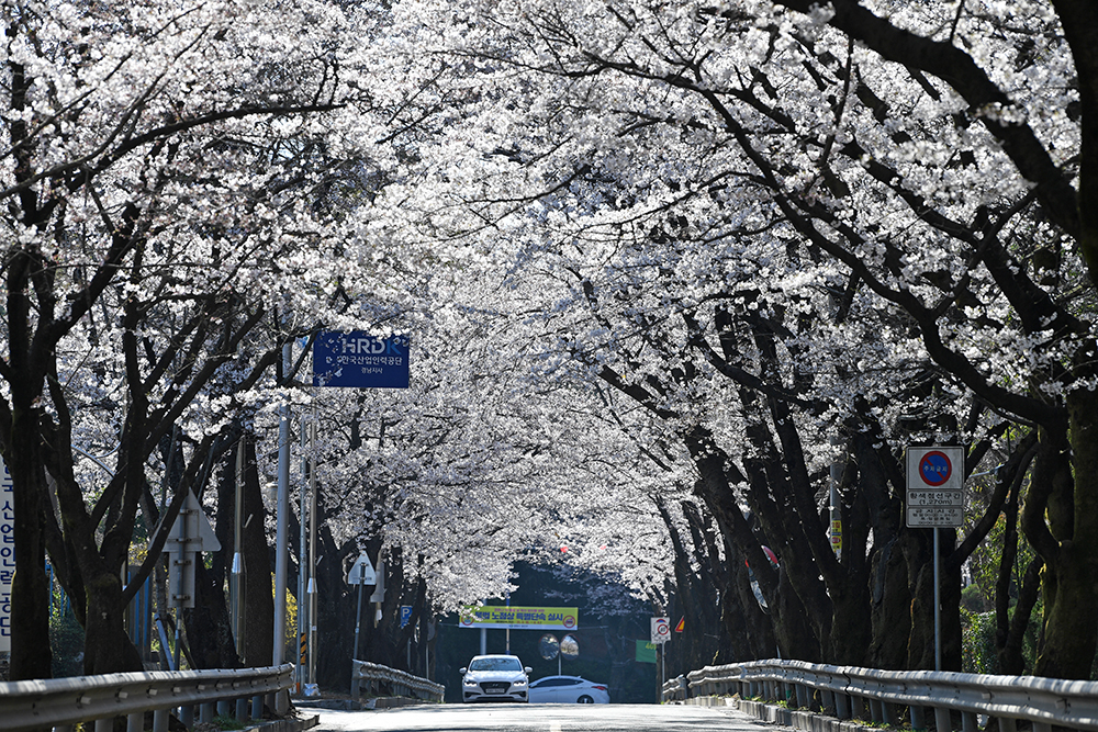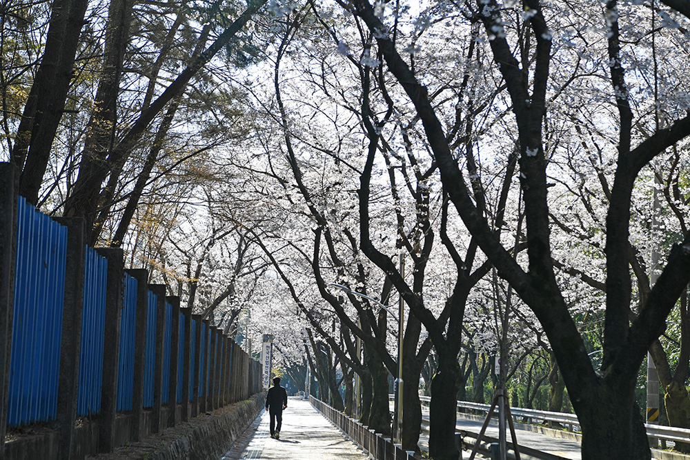 다음은 '한국산업인력공단 경남지사' 앞으로 옮겼습니다. 큰 벚꽃나무가 터널을 이루는 이 일대 최고의 벚꽃스팟 입니다. 특히 아침 시간대는 역광 때문에 이른 아침의 상쾌한 분위기를 연출하고 있어 더욱 좋았습니다.