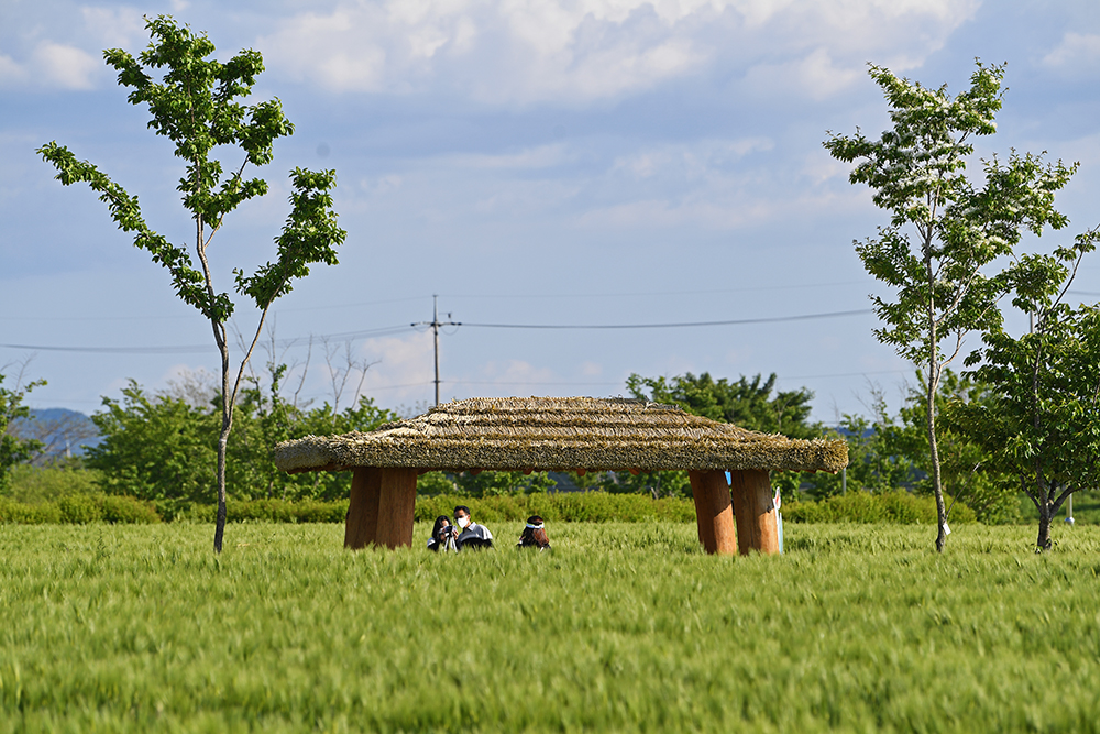 청보리밭에 들어섭니다. 중간 중간에 조성된 초가 지붕의 정자가 매우 정겹습니다. 정자와 어우러진 청보리밭의 모습을 살포시 담아 봅니다.