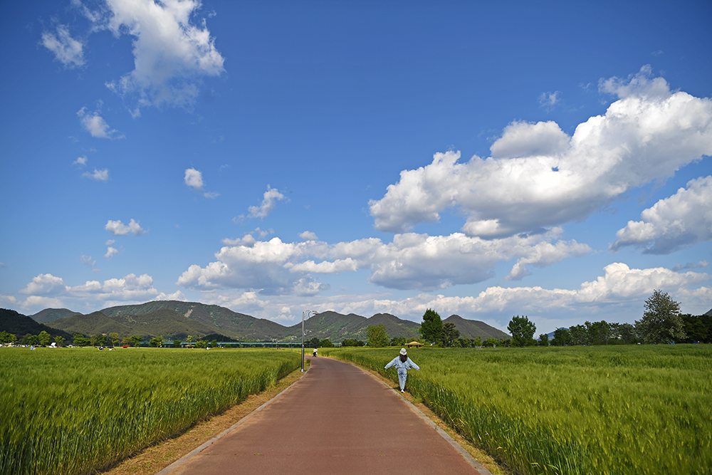 이맘때의 강나루생태공원은 뭐니뭐니해도 청보리밭이 가장 멋집니다. 때마침 날씨도 너무 좋습니다. 파란하늘과 흰 구름이 두둥실... 무릇 봄 날씨가 이래야 하는 것 아니겠습니까? ㅎㅎ 보리밭 사잇길을 거닐며 멋진 전경을 즐겨야 합니다. ㅎㅎ