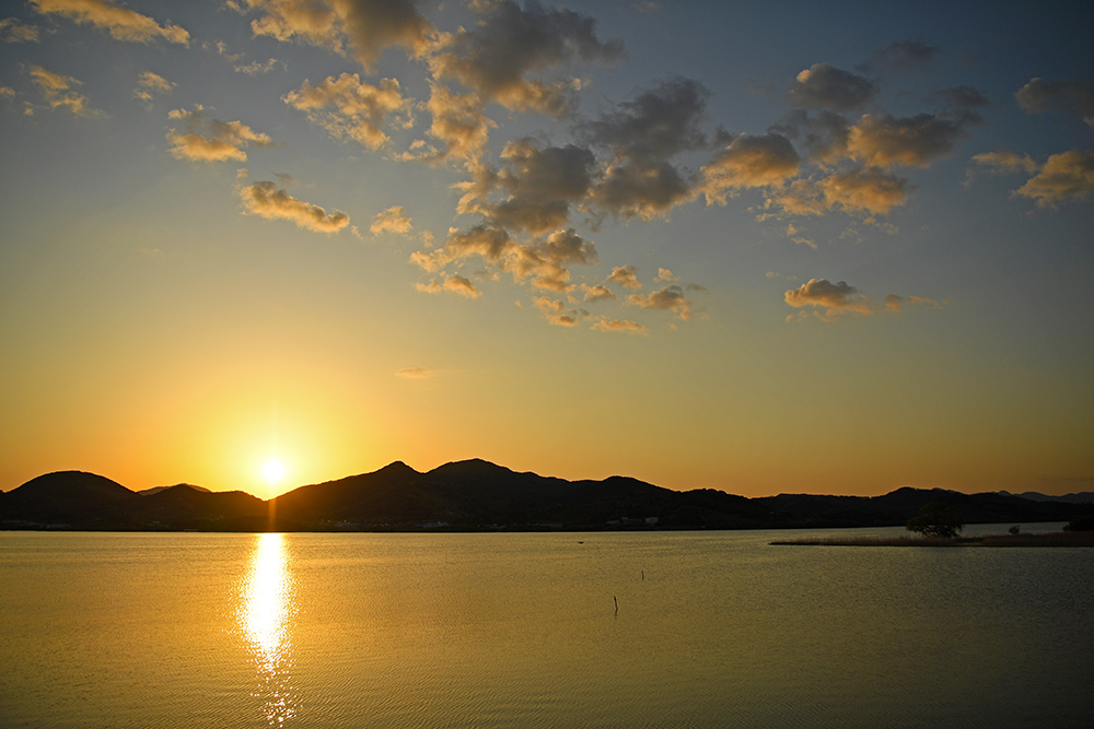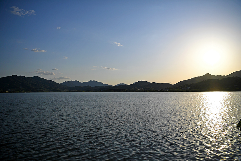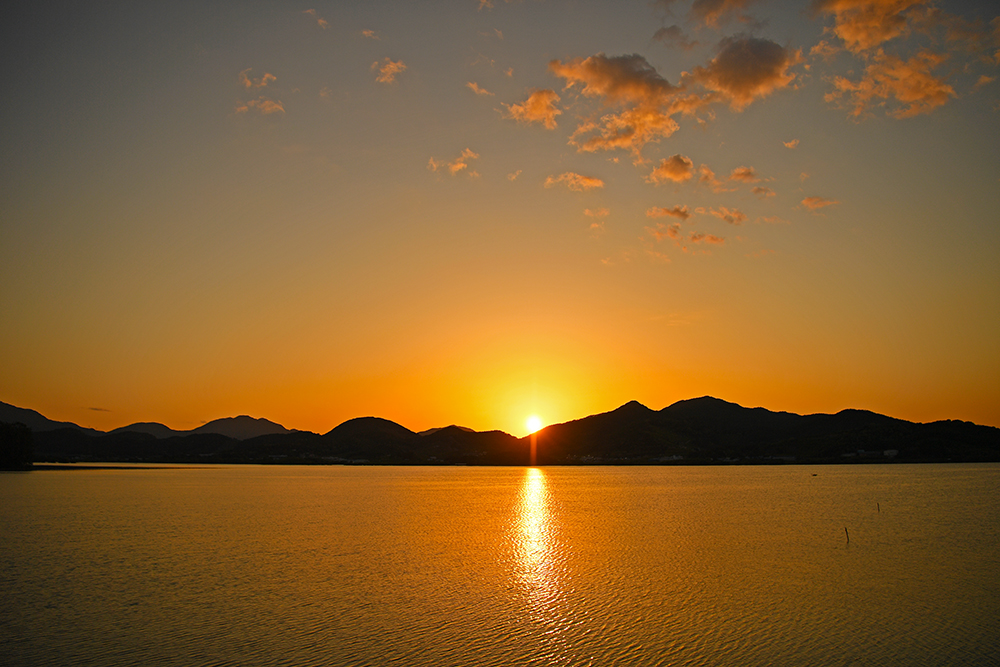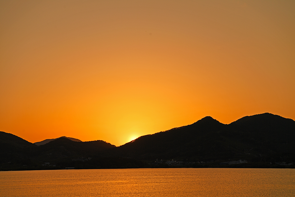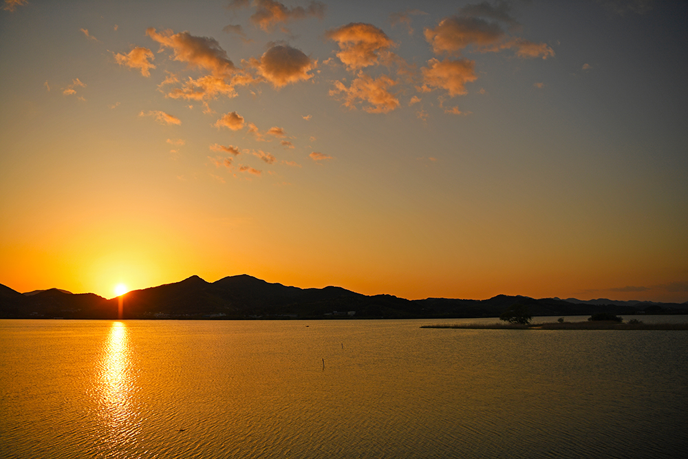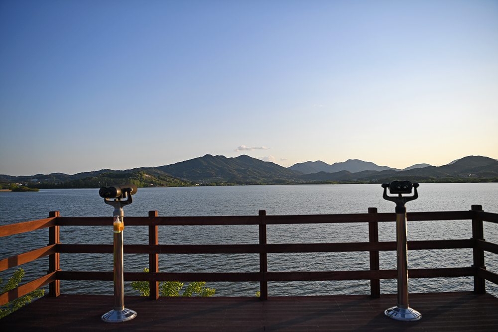 다시 쉼터 앞으로 돌아와서 저수지를 살펴보니 곧 일몰이 시작될 것 같습니다. 그런데 태양은 가장 높은 산봉우리로 넘어갈 듯합니다. 불현듯 지난해 유채꽃 배경으로 일몰을 담으려다 실패했던 기억이 떠오릅니다.
