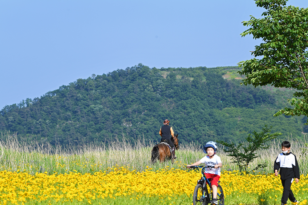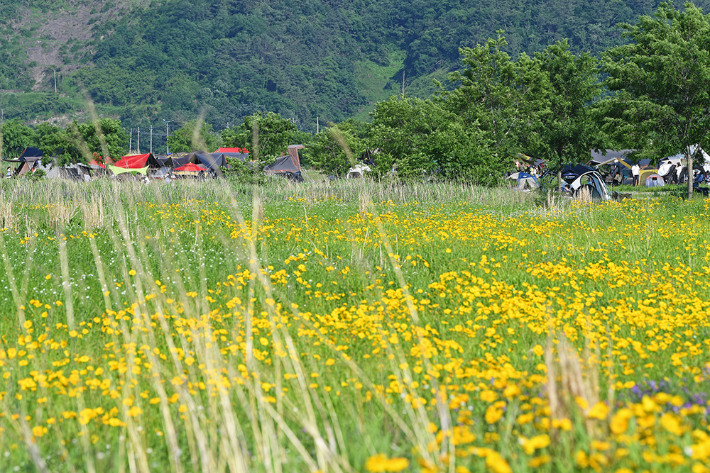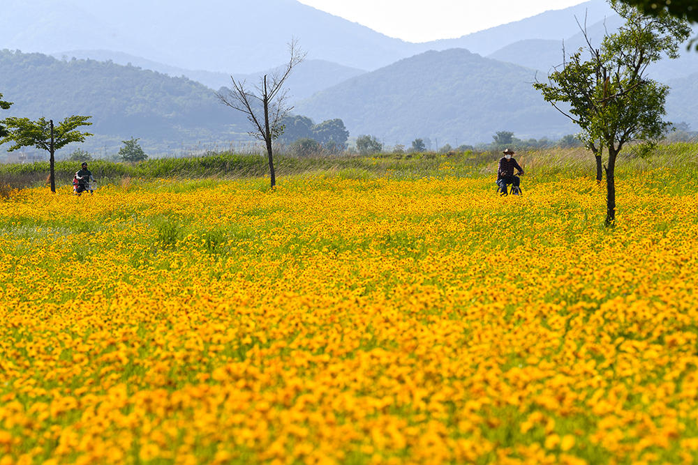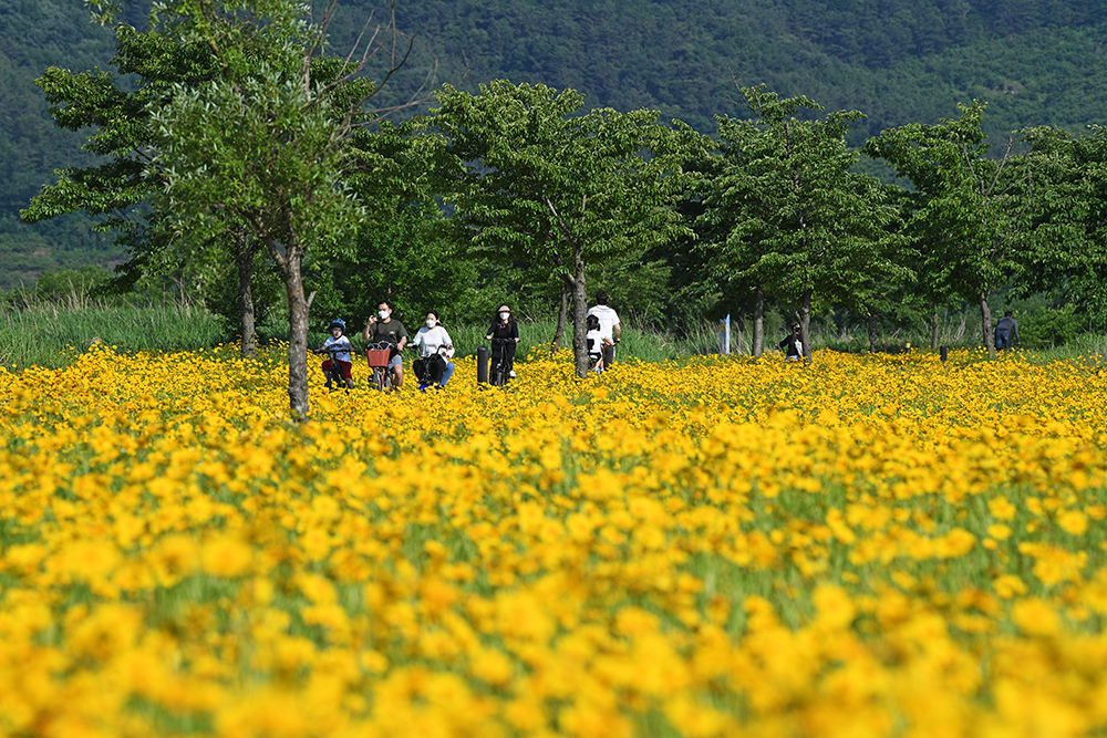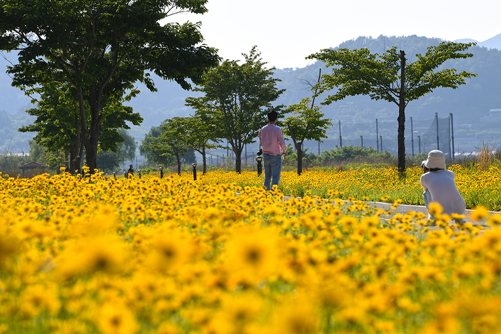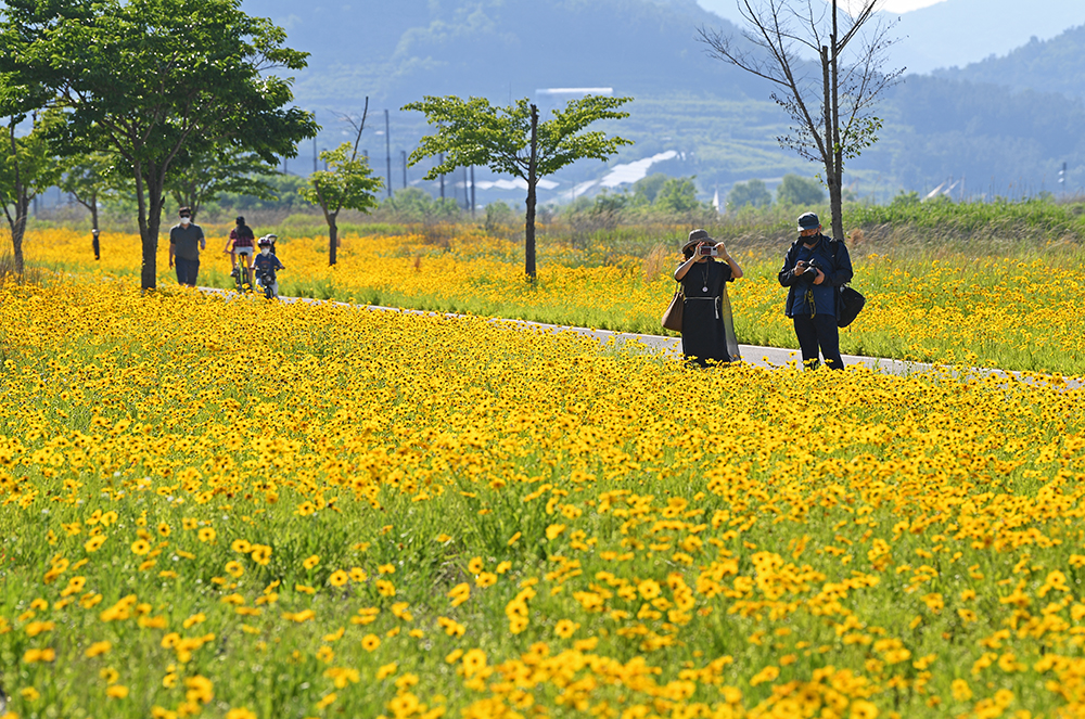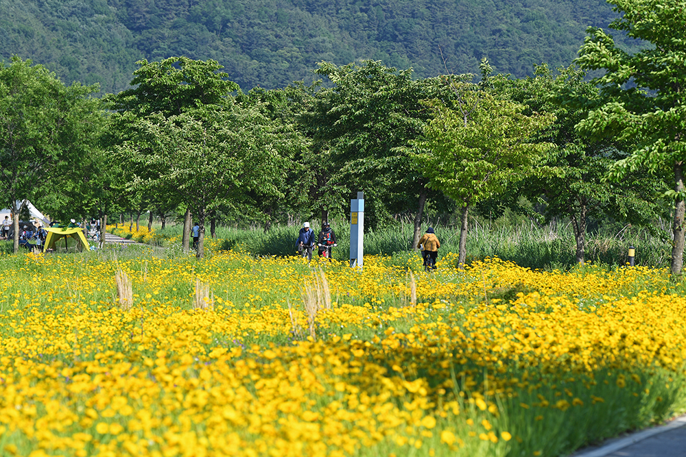 평소에는 명촌마을 앞에 있는 북면생태공원 구역에서 금계국을 즐겼습니다. 하지만 올해는 금계국을 즐기려는 사람들로 많이 붐빕니다. 할 수 없이 한참 아래쪽에 있는 자전거무료대여소 인근에서 금계국을 즐겼습니다.