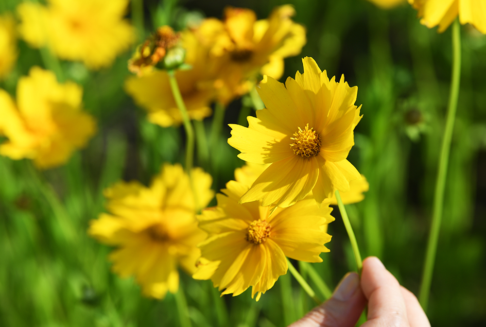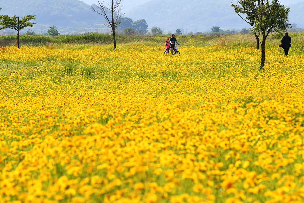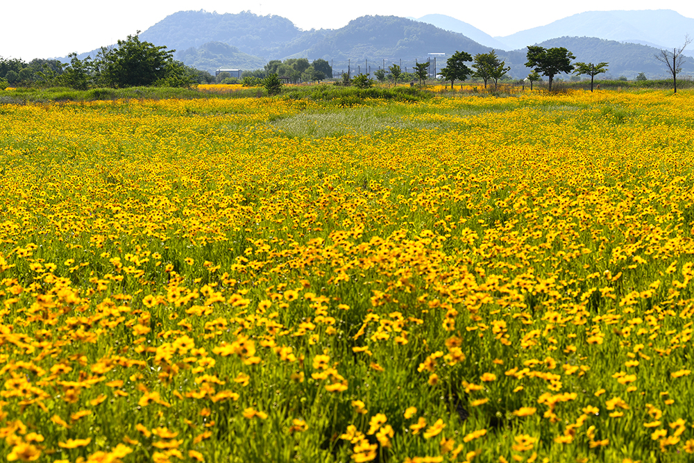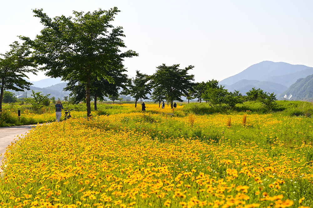 금계국의 꽃말은‘상쾌한 기분’입니다. 금계국을 볼때마다 기분이 좋아지는 이유가 다 있었던 셈입니다. 낙동강의 시원한 강바람이 있어 더더욱 상쾌해지는 곳이 북면수변생태공원인데요, 이곳의 금계국은 지금이 한창이랍니다.