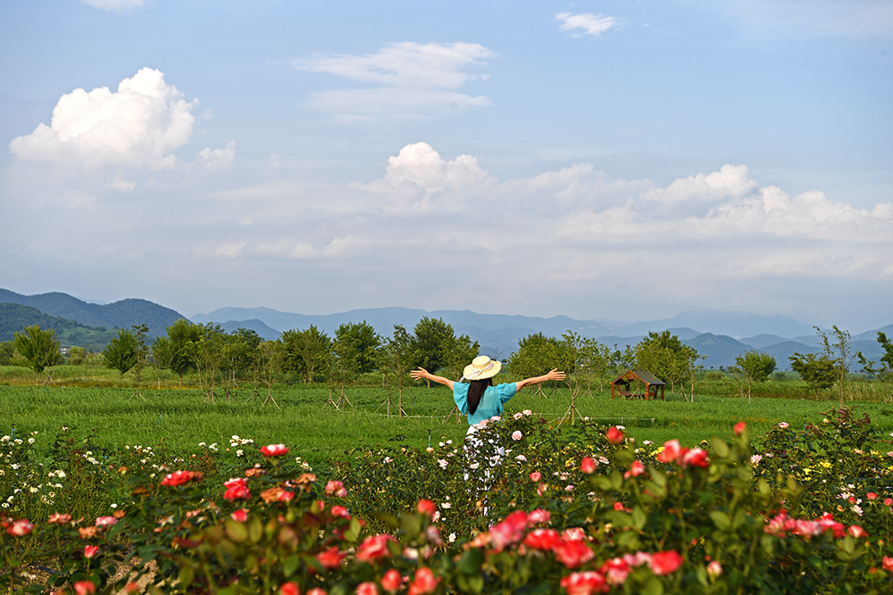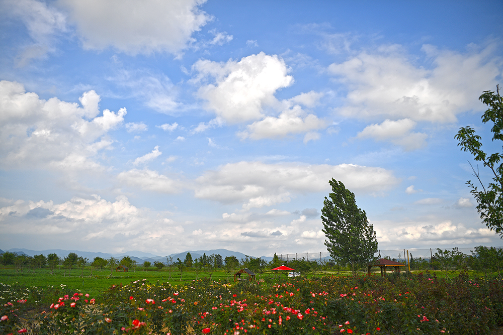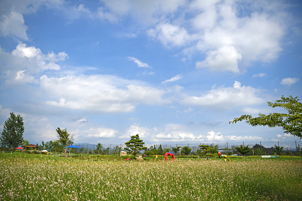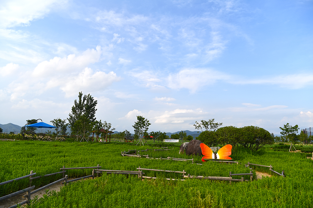 주차장 도착 후 먼저 대산플라워랜드를 한번 쓰윽 둘러봤습니다. 때마침 나타난 파란 하늘이 나타나 분위기를 띄워줍니다. 게다가 시원한 강바람까지 불어와 나들이에 나선 마음을 즐겁게 해줍니다.ㅎ