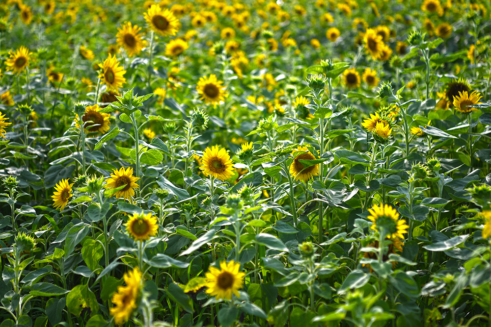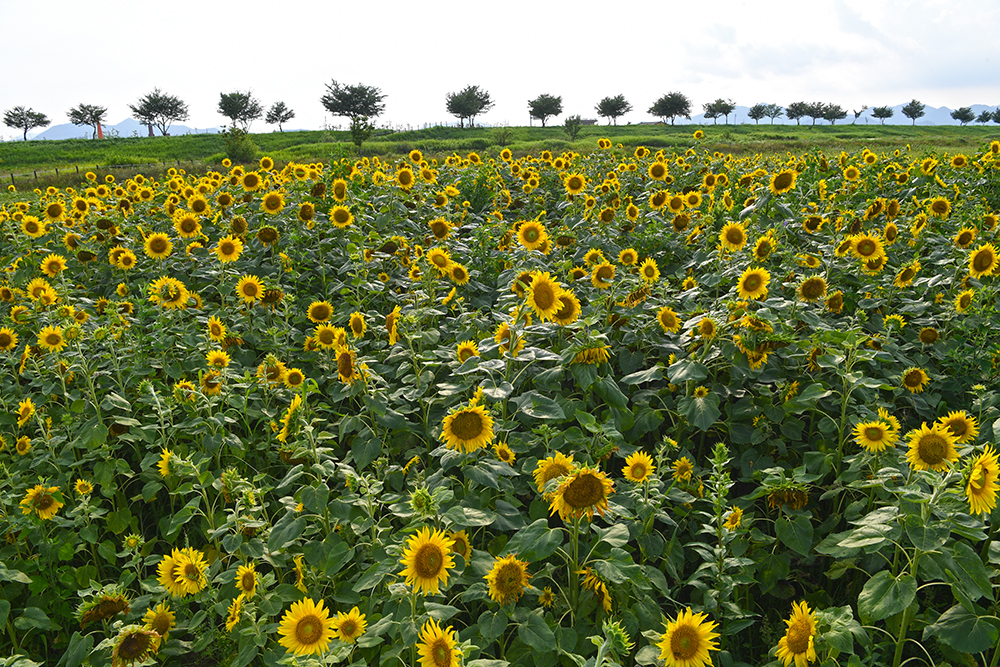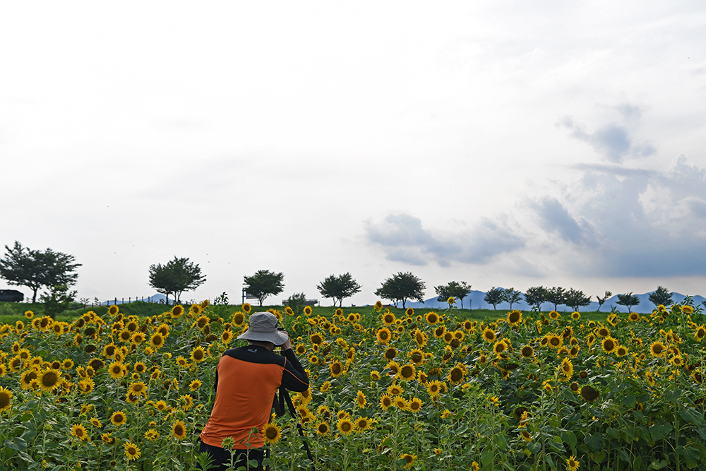 해바라기 군락은 크게 두 곳입니다. 대산야구장 펜스와 둑방 근처입니다. 그 중에 둑방 근처 군락지가 더 넓고 좋아 보여 먼저 그 쪽에서 해바라기 군락지 전경을 위주로 즐겨 봅니다.