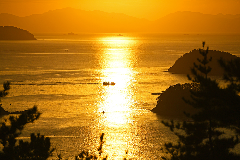 멋진 모습이지만, 다소 밋밋한 모습을 걱정했습니다. 그때 어디선가 나타난 고깃배가 노을 빛 속으로 빠져 들어갑니다. 예쁜 모습을 보며 저도 황홀한 노을경에 빠져봅니다.