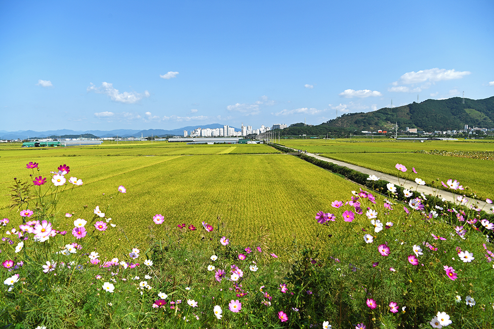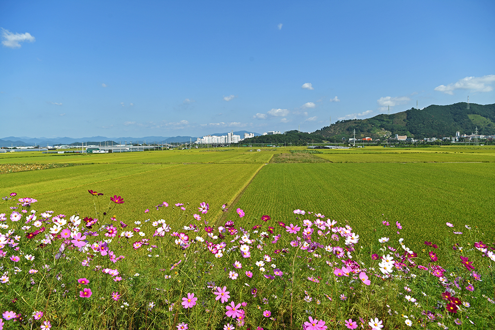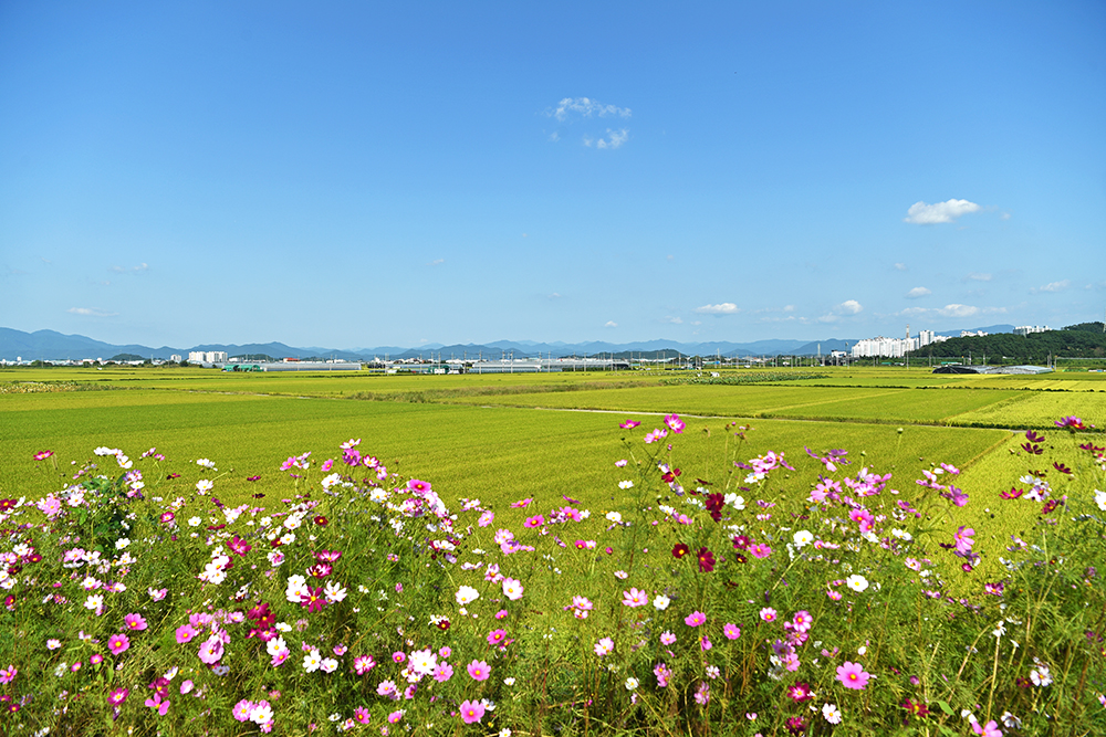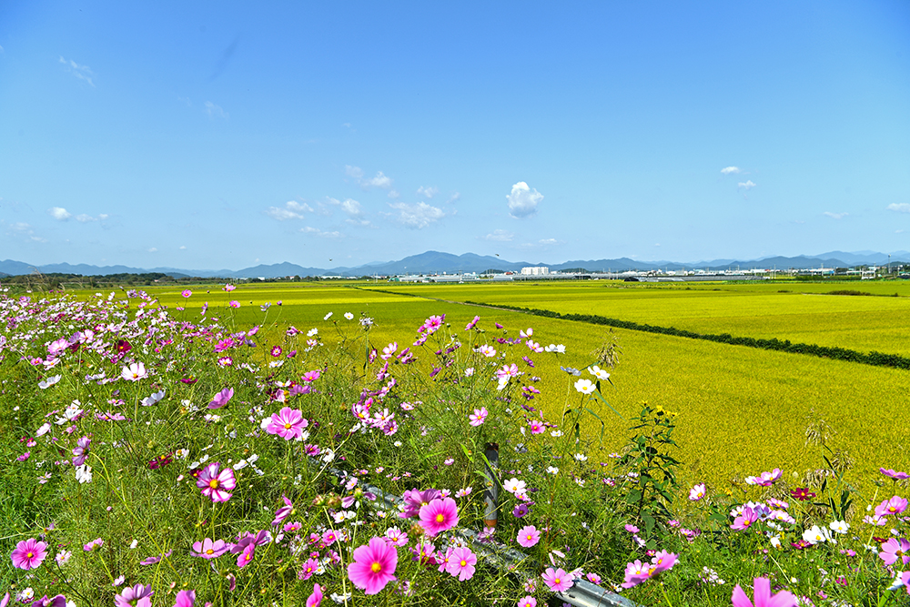 코스모스길을 걸으며 한창 가을을 재촉중인 미내포 들판을 조망해 봅니다. 누렇게 익어가는 들판은 언제라도 황금 옷으로 갈아입을 태세입니다. 파란하늘과 알록달록 코스모스와 어우러진 모습이 참 예쁩니다. ㅎㅎ