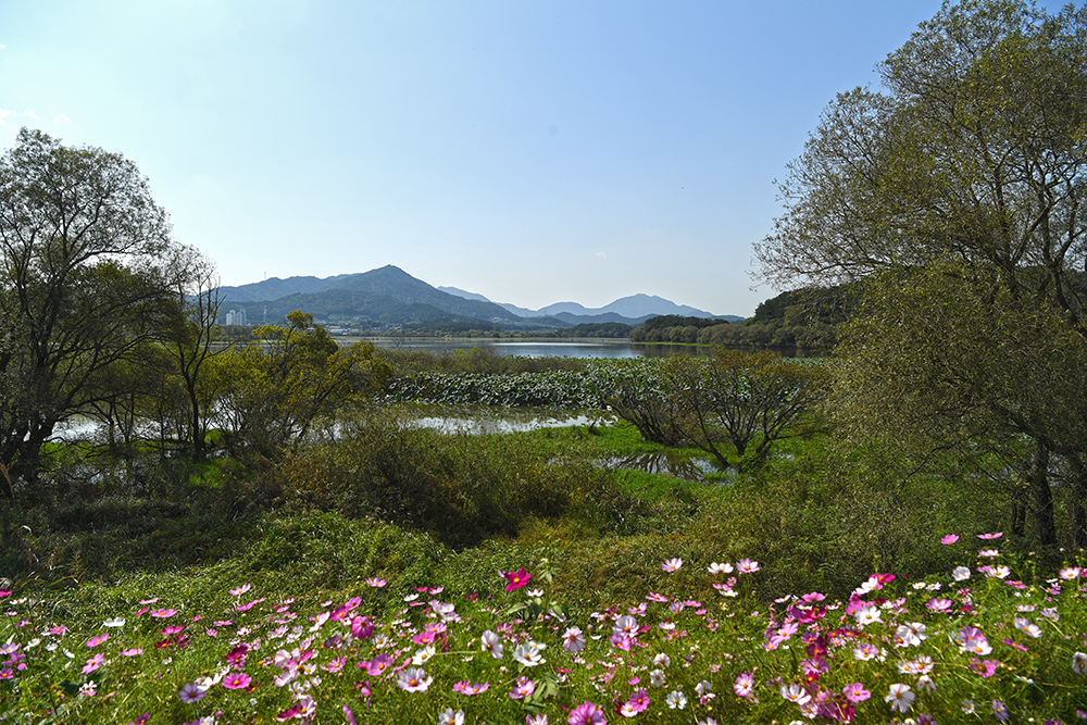 코스모스 길을 따라 중간쯤 가다보면 동판저수지가 나타납니다. 철새 울음소리가 가까이서 들리기도 하는데요, 코스모스와 어우러지는 저수지의 모습도 담아봅니다. ^^