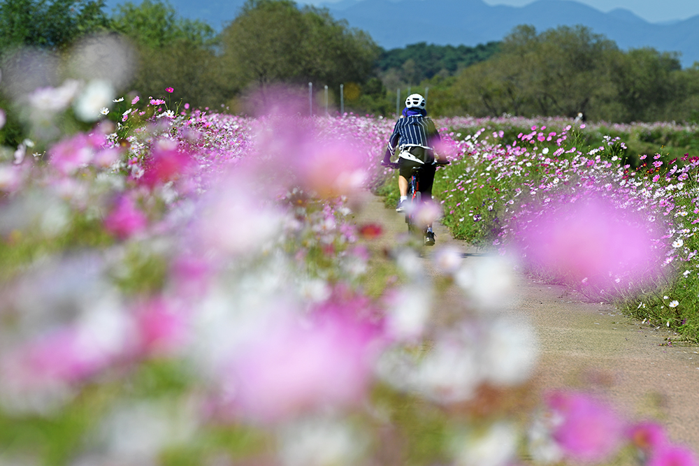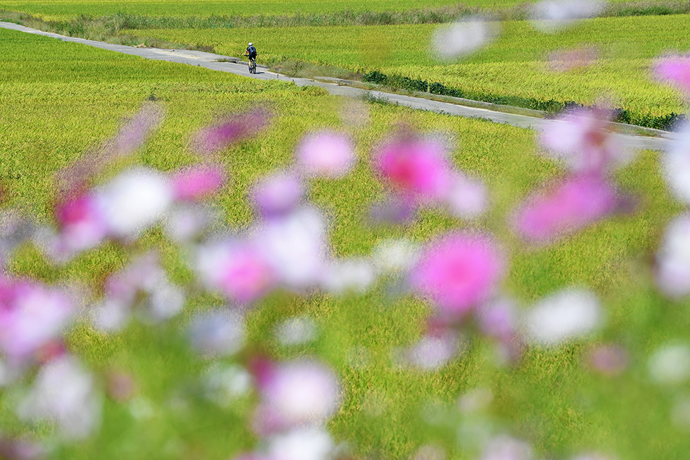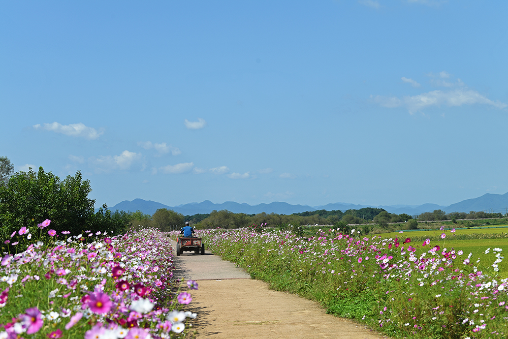 무점마을 코스모스길에는 의외로 자전거 라이딩을 즐기는 분들이 많습니다. 둑방길과 들판 사이로 라이딩을 즐기는 모습을 보니, 저도 덩달아 자전거를 타고 달려보고 싶어집니다. ㅎㅎ