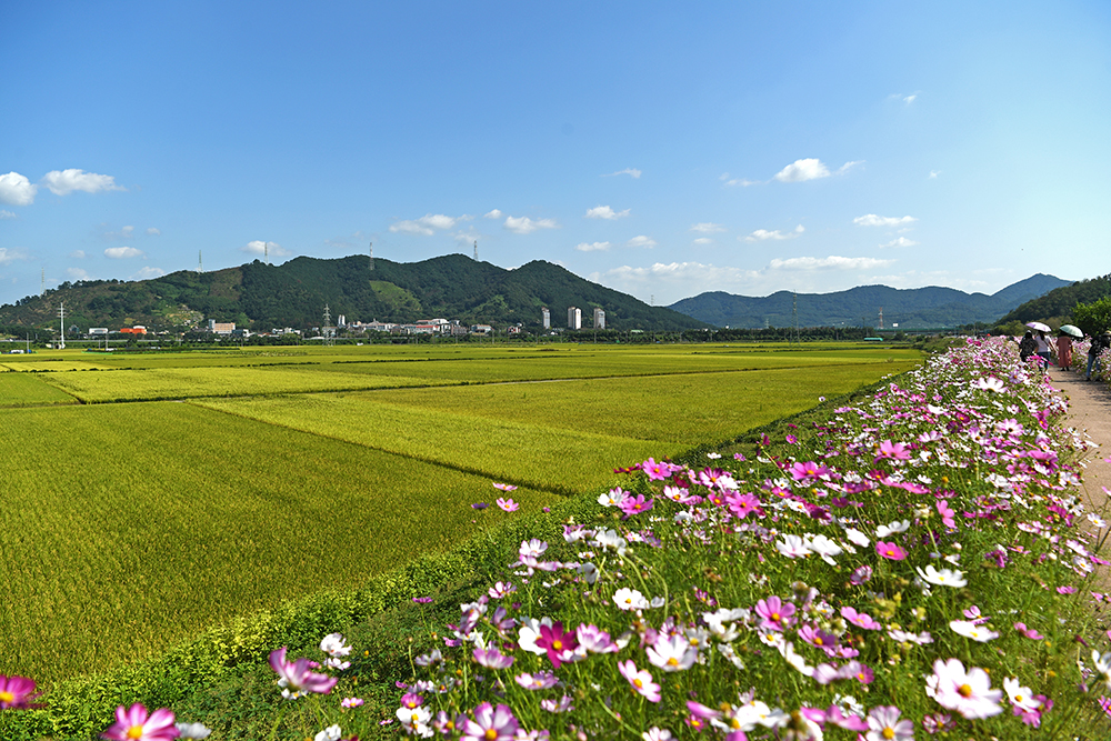 먼저 둑방에 올라서니 흐드러지게 핀 코스모스와 누렇게 익어가는 황금 들판을 바라보며 가을의 정취를 느껴봅니다. 무점마을 코스모스길은 황금 들판과 코스모스가 가장 큰 매력입니다.^^