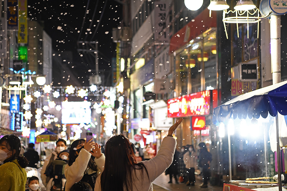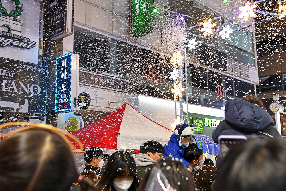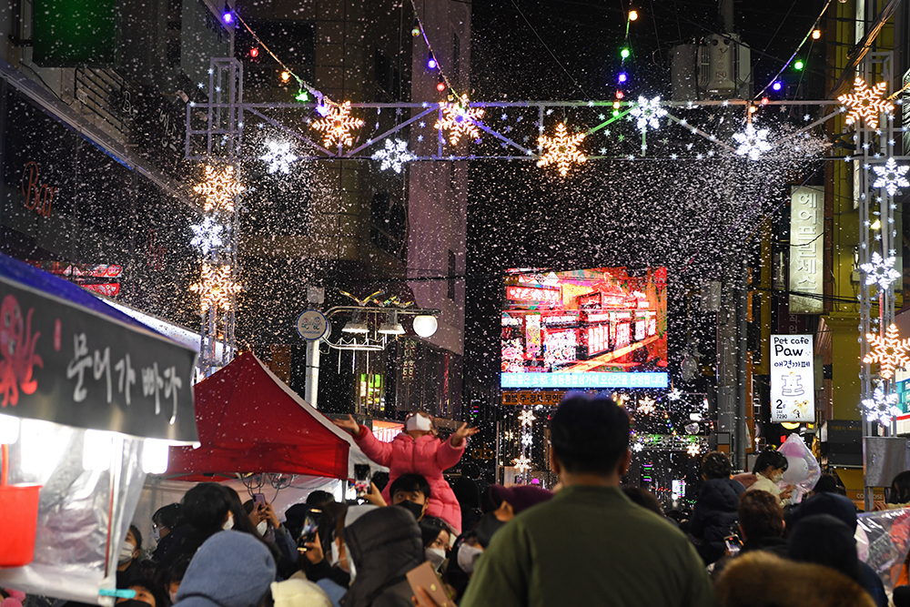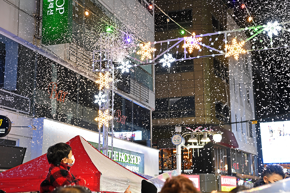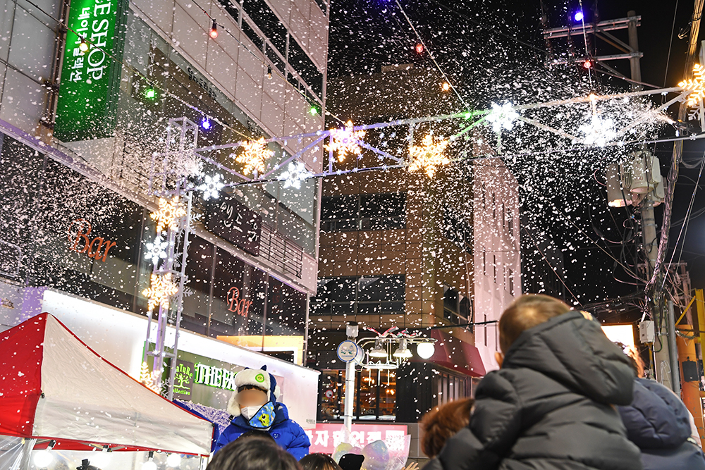 창동 예술촌의 인공눈은 매주 주말 오후 6시, 7시, 8시, 9시 4번에 걸쳐 15분간 눈이 내립니다. 이 시각이 되면 전성기 시절의 창동을 연상시킬 만큼 많은 인파가 몰려듭니다. 그 덕분에 주변 가게에서도 즐거운 비명입니다. 눈 보기 어려운 창원 지역에서는 매우 신박한 아이템입니다. 비록 인공눈이지만 올 연말까지 운영한다고 하니 즐겨 보시기 바랍니다.