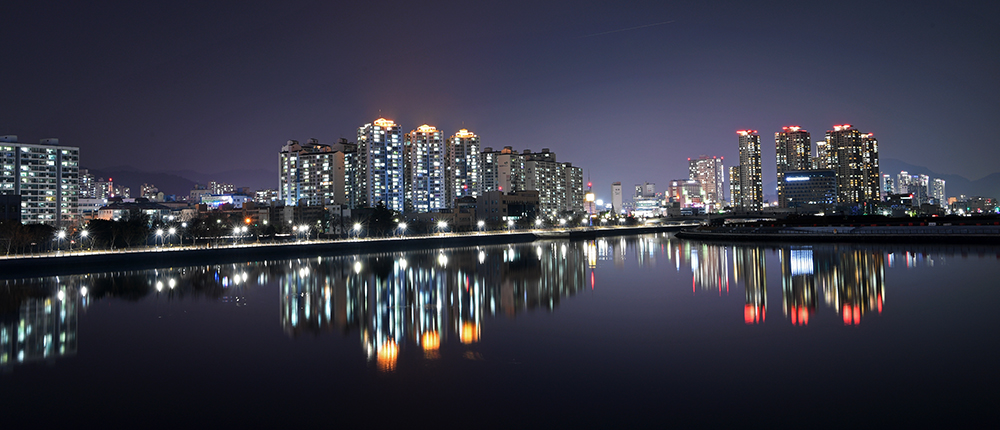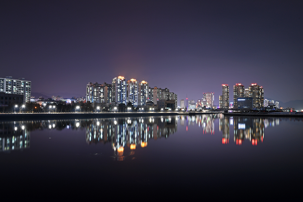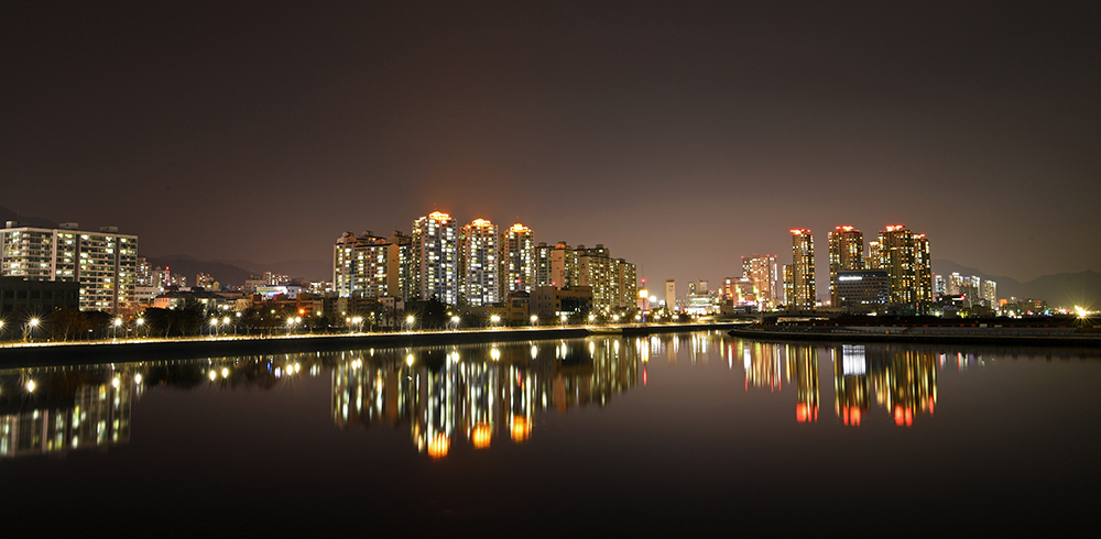 쉬이 눈을 뗄수 없는 모습이 있습니다. 반영을 이루는 도심야경 입니다. 보도교 위에서도 담아보고, 내려와서도 담아봤습니다. 카메라 설정값에 따라 다양한 느낌을 보여줍니다. ㅎ