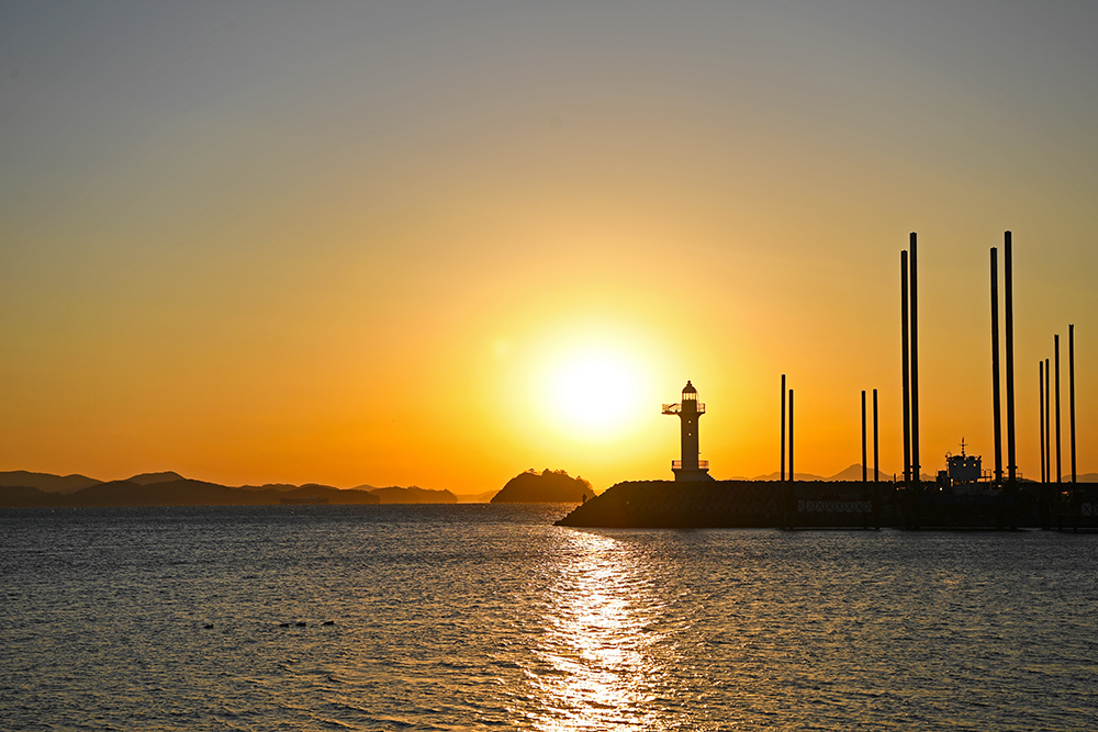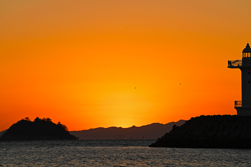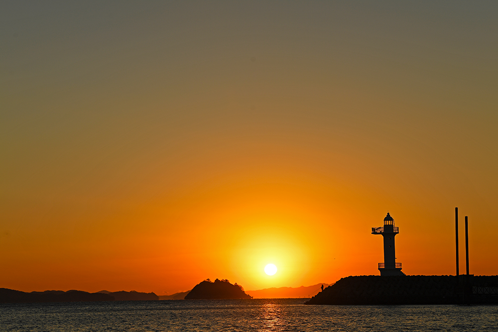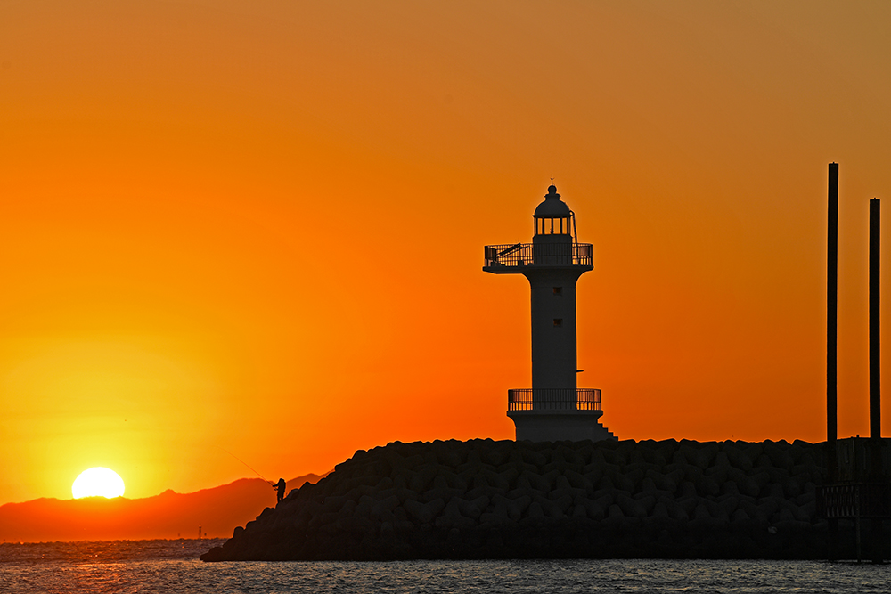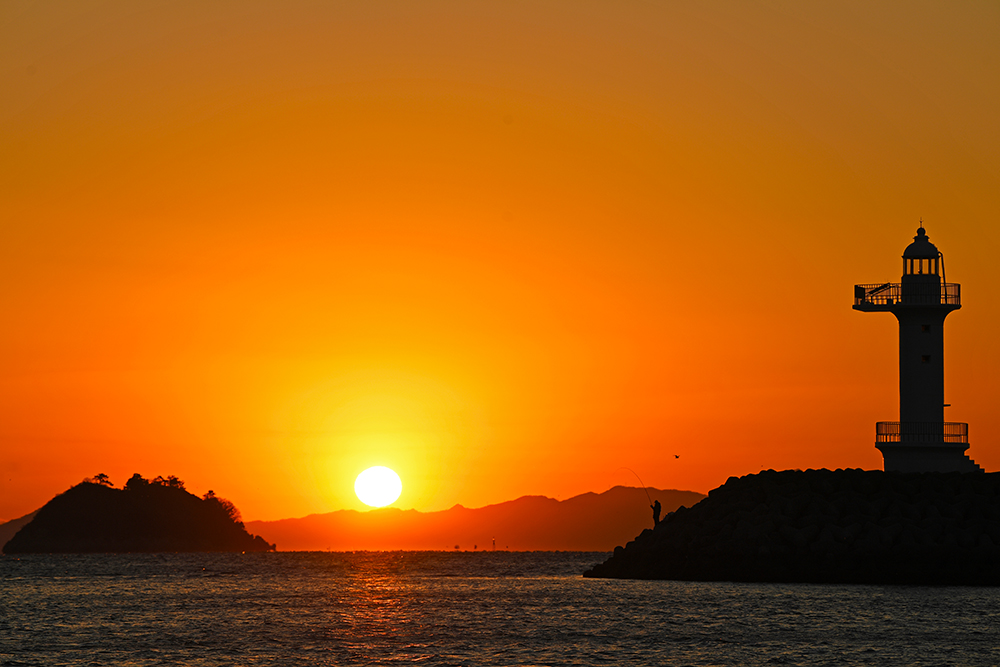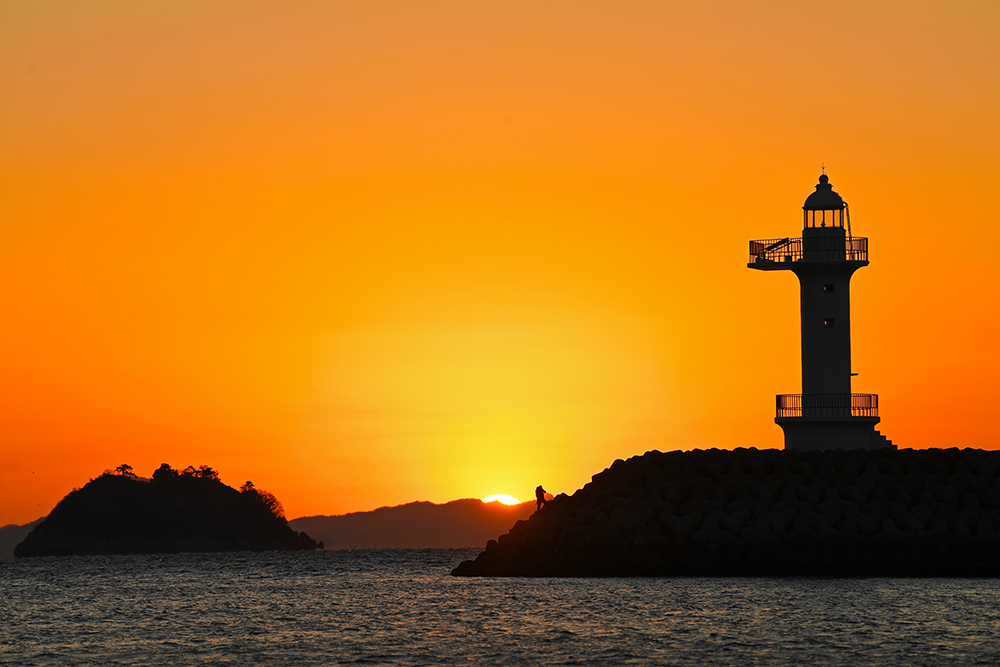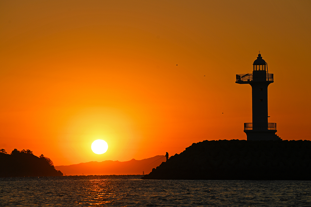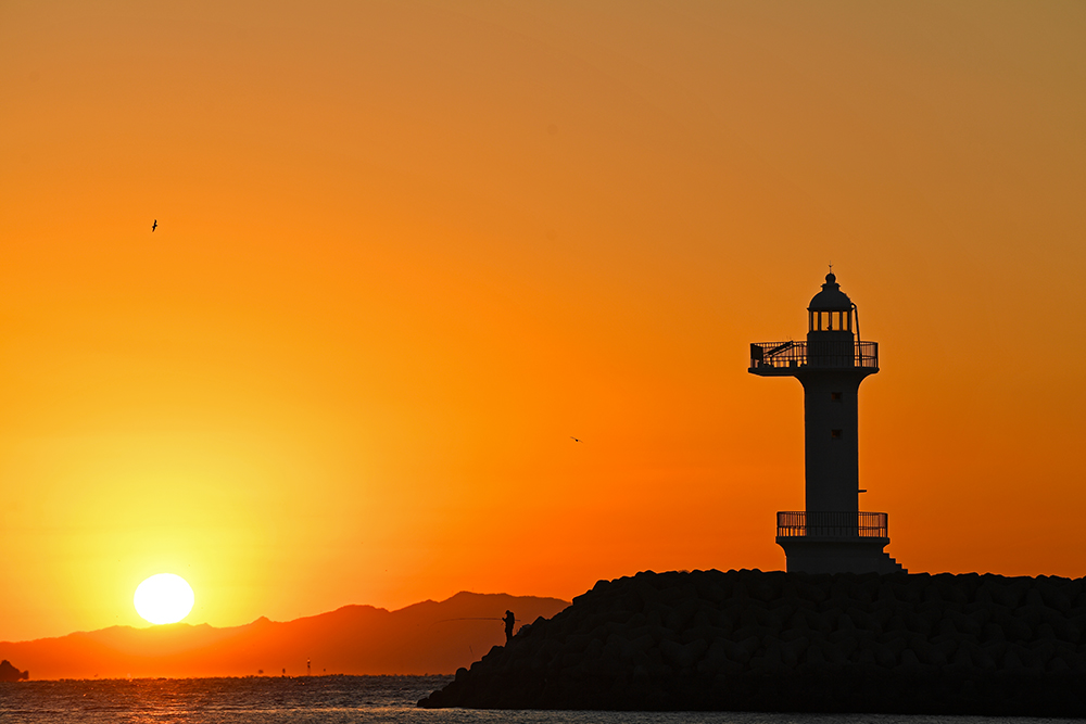 포인터를 찾았습니다. 방파제 끝에 있는 등대와 바다의 섬 사이로 떨어지는 태양을 담으면 좋을 것 같습니다. 무엇보다도 방파제 끝에는 홀로 낚시를 즐기는 분이 계십니다. 마치 저의 일몰 여행에 출연해주신 것 같아 무척 감사한 마음입니다. ㅋㅋㅋ