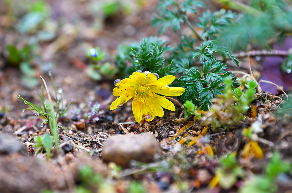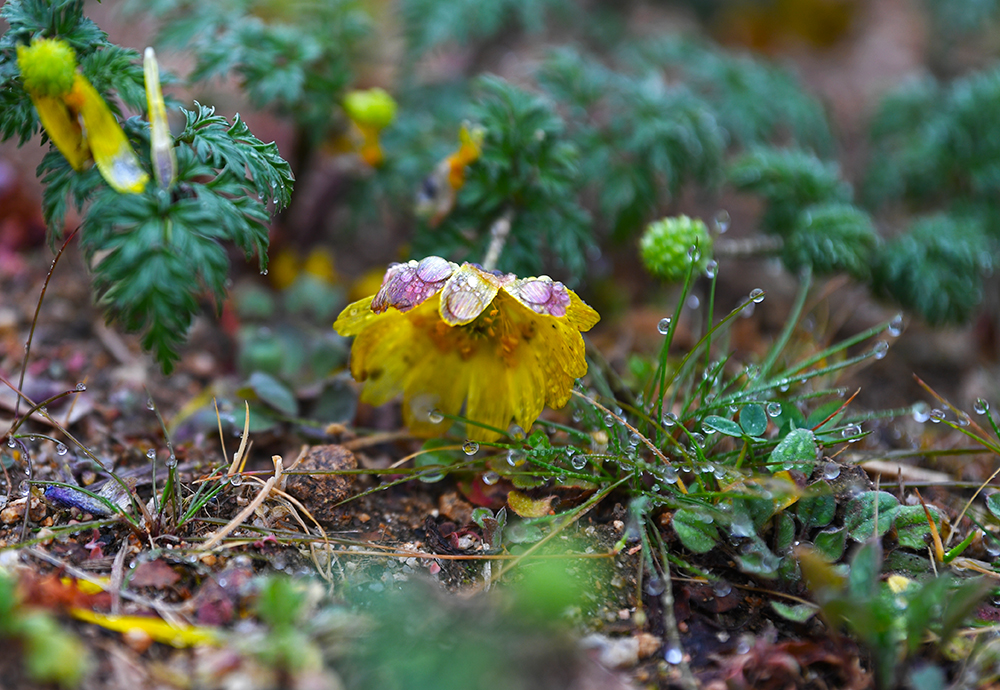 이제 예쁜 아이들을 찾아 나서 봅니다. 몇 걸음 옮겼을까? 복수초가 눈에 보입니다. 여기서는 처음 본것 같습니다. 고개숙인 모습을 보니 방울방울 꽃 잎에 맺힌 빗방울이 힘겨워 보입니다. 하지만 싱그러운 모습은 어쩔수가 없네요~~^^