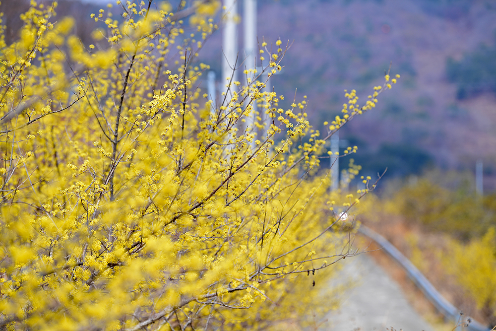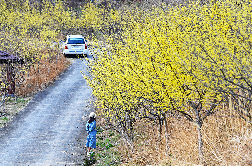 그래서 찾아 나선 곳은 창원 산수유 마을인 현동 예곡마을입니다. 2년 만에 찾았는데, 마을입구 버스 정류장에는 3대 정도 주차할 수 있는 공간이 생겼습니다. 먼저 마을 입구에서 산수유 길을 조망해 봅니다. 마치 노란 봄 속으로 들어가는 듯한 아련한 느낌을 만끽해봅니다.
