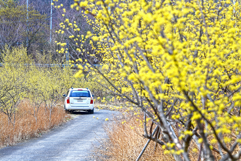 새로운 포인터를 발견했습니다. 산수유 길이 꺽어지는 곳의 비탈에 올랐습니다. 그곳에서 산수유 길을 내려다 보니, 산수유 사이로 도로가 보입니다. 그 속으로 지나가는 사람과 승용차의 모습이 이채롭습니다. ㅎㅎ