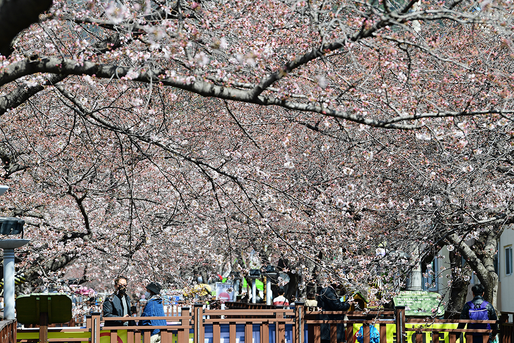 ‘손대면 톡하고 터질것만 같은 그대’라는 노랫말처럼, 지금 여좌천 벚꽃 개화 상태가 딱 그러합니다. 이번 주말부터는 모든 나무에서 개화할 것 같습니다. 아쉽게도 진해군항제는 올해까지 3년 연속 취소되었지만, 누가 뭐라해도 벚꽃은 진해 여좌천이 최고입니다. 비록 코로나19에게 빼앗긴 우리의 일상이지만, 새봄과 함께 벚꽃들은 찾아옵니다.