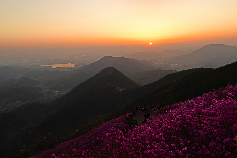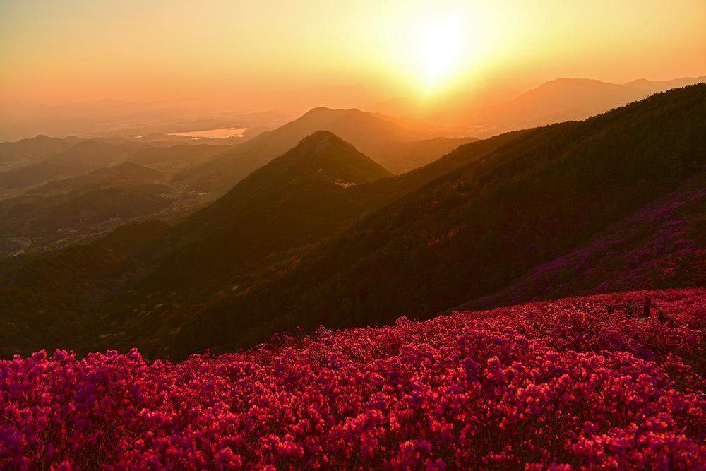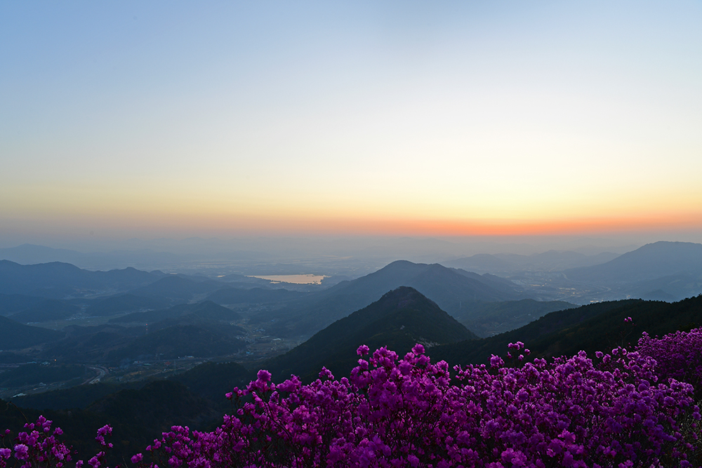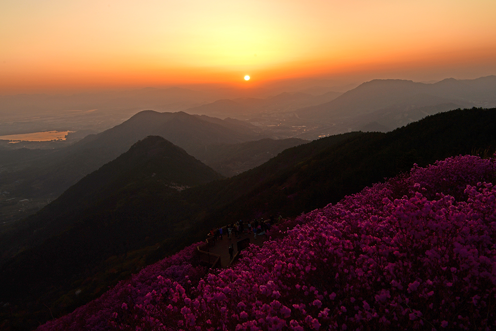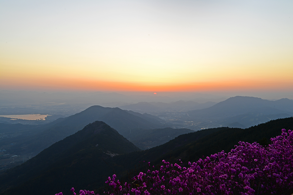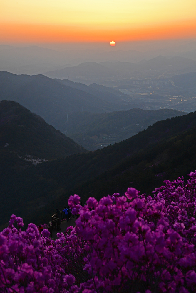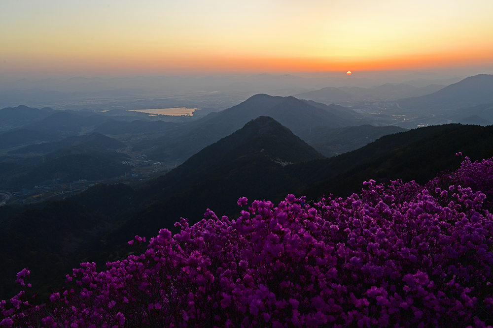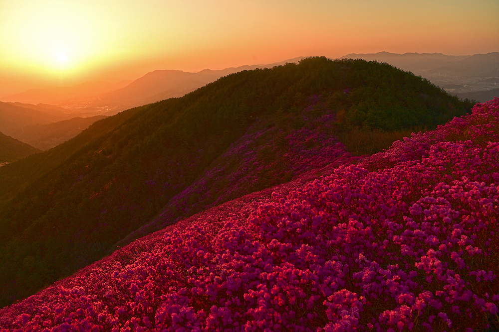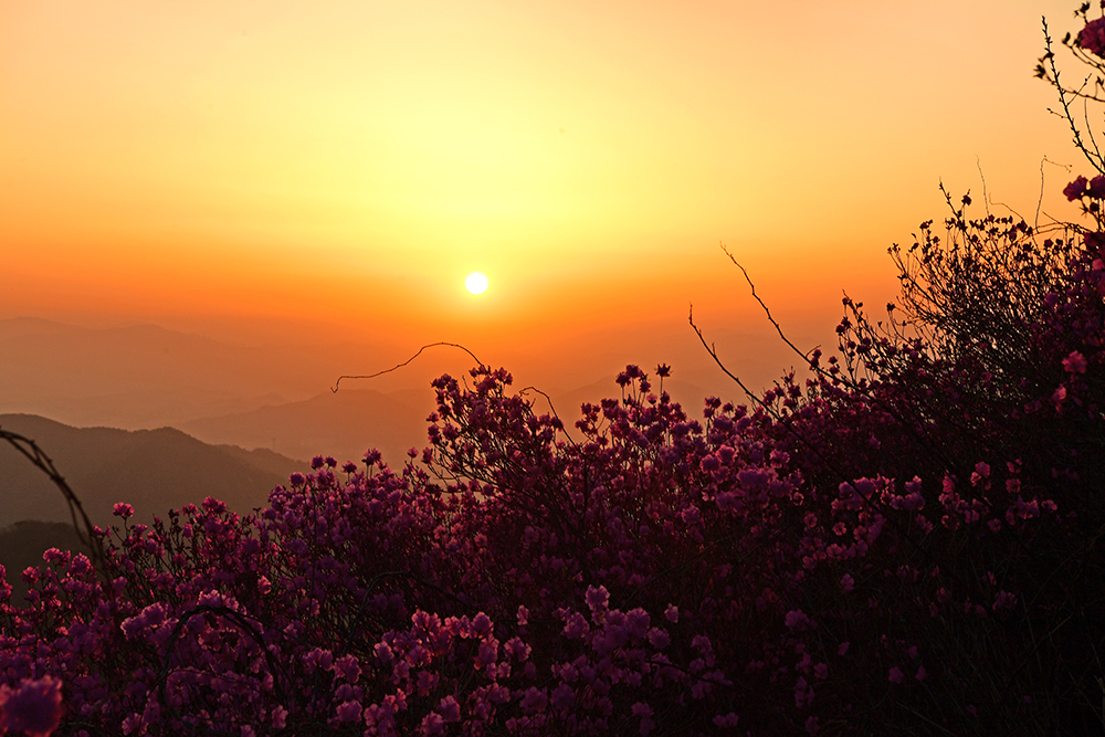 남아있는 붉은 기운을 배경으로 진달래 군락지를 담아 봅니다. 붉은 태양이 점차 밝아졌지만, ‘황홀하다’는 표현이 전혀 어색하지 않습니다. 다음에는 붉은 일출을 배경으로 담아보면 더욱 멋질 것 같습니다.