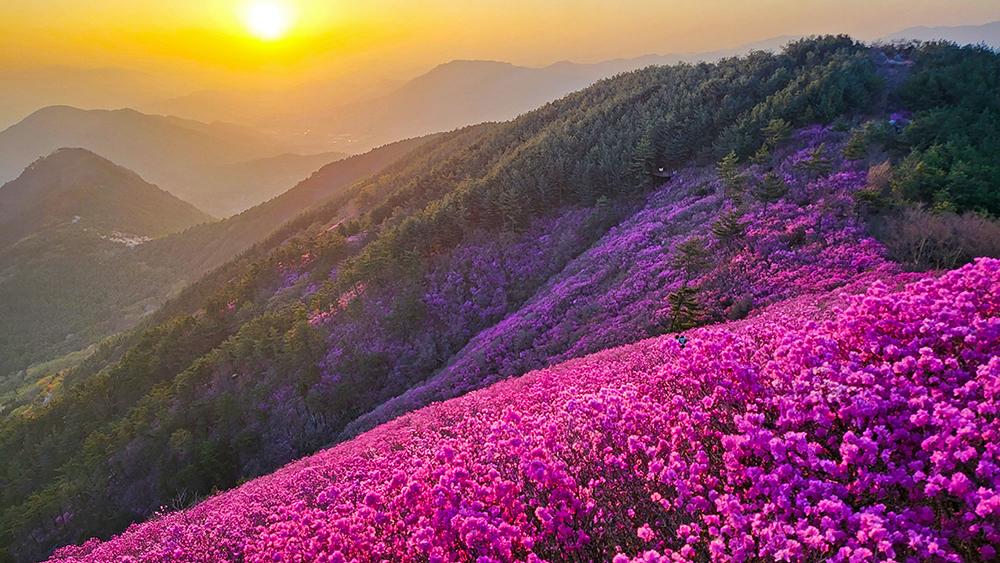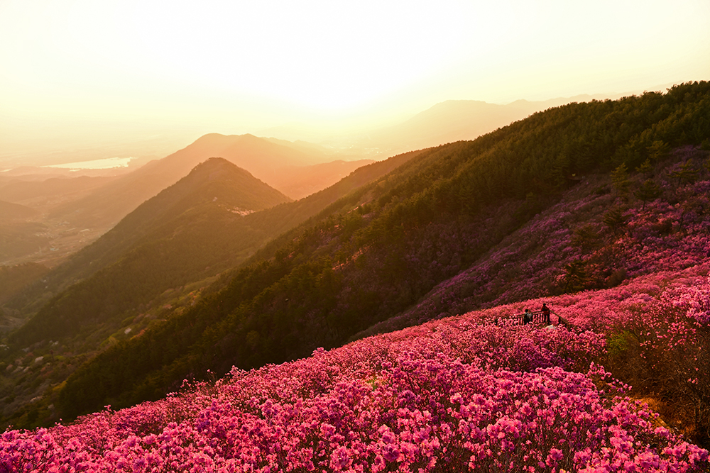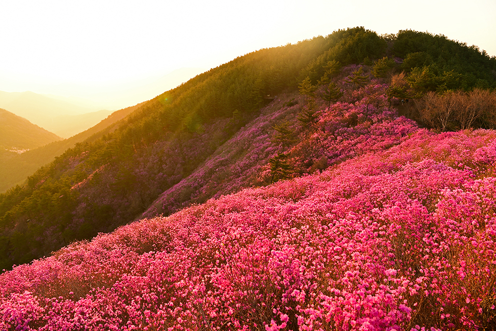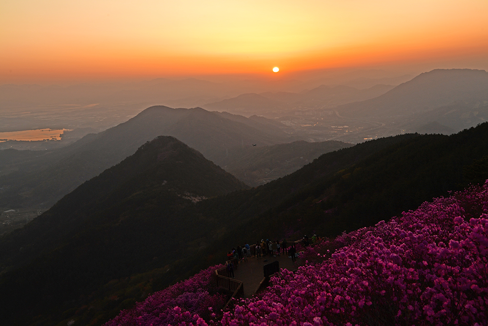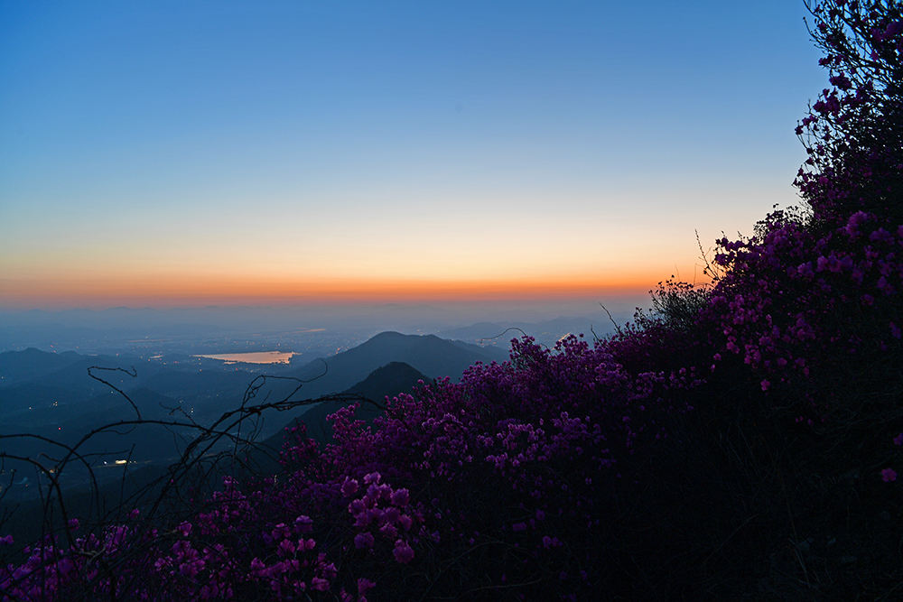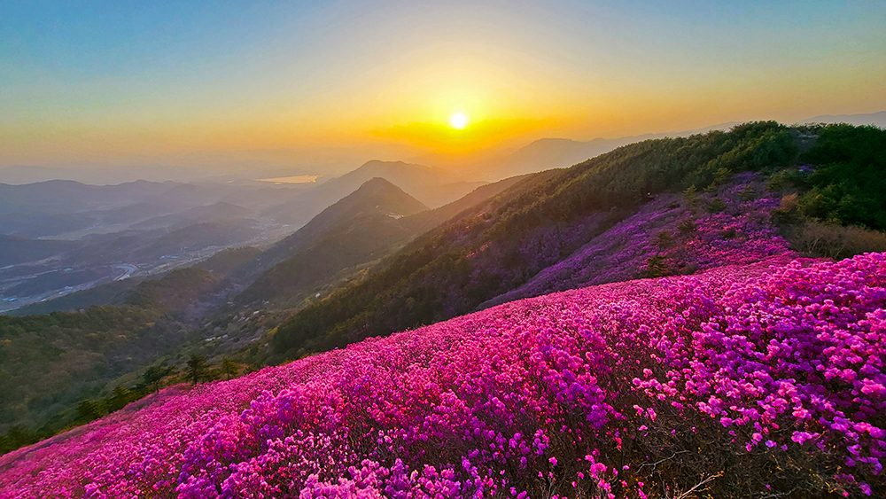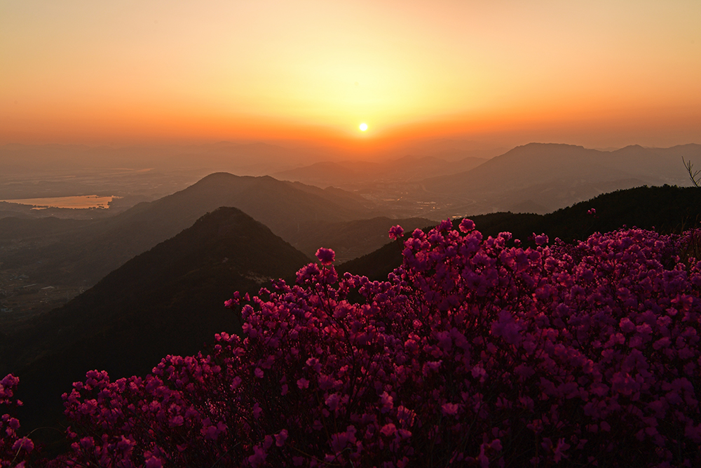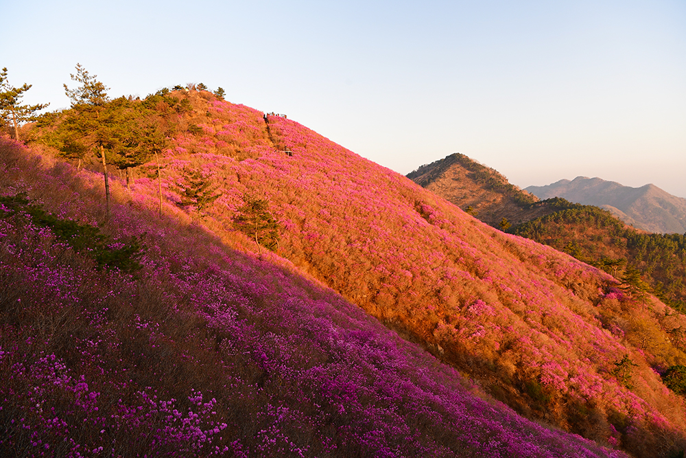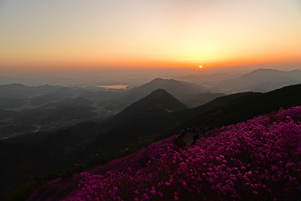 남아있는 붉은 기운을 배경으로 진달래 군락지를 담아 봅니다. 붉은 태양이 점차 밝아졌지만, ‘황홀하다’는 표현이 전혀 어색하지 않습니다. 다음에는 붉은 일출을 배경으로 담아보면 더욱 멋질 것 같습니다.