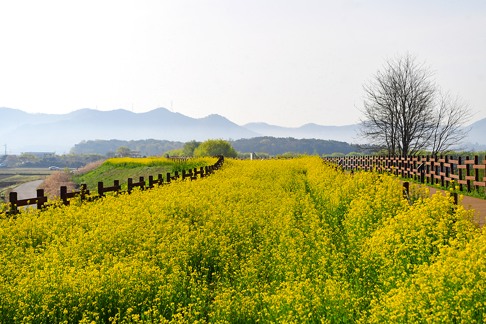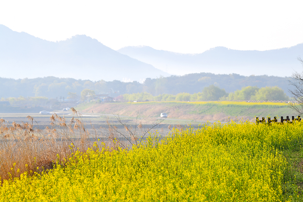 재두루미 쉼터 부근 입니다. 개인적으로 가장 좋아하는 포인터 입니다. 주변으로 활짝 만개한 유채꽃 물결이 장관인데다, 무엇보다도 S자 모양의 둑방길이 이어지면서 멋진 모습을 담을 수 있는 곳입니다.