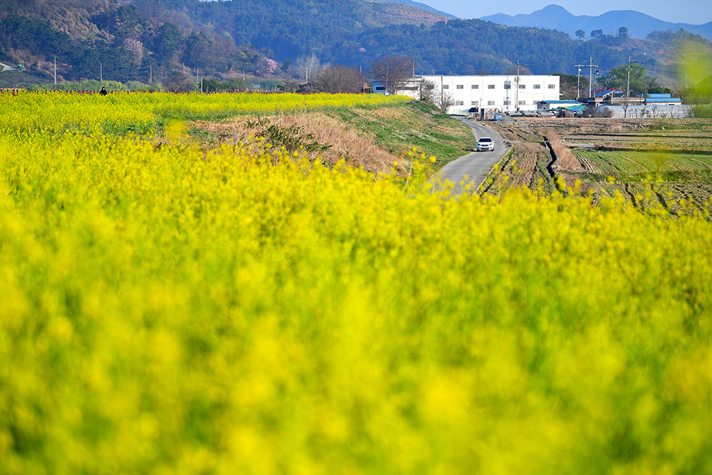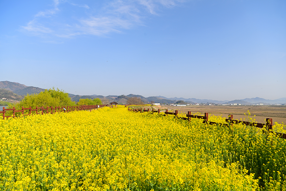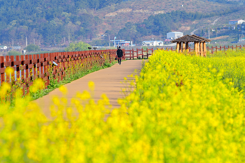 방문객들이 많을 것 같아, 이른 아침에 도착했습니다. '재두루미 쉼터' 뒤편 농로의 빈 공간에 주차하고 탐방로에 올랐습니다. 울창하게 피어난 유채꽃 물결은 역시 장관입니다. 저수지 입구쪽 방향 유채꽃이 더 풍성해 보입니다. 그래서 먼저 입구 쪽까지 걸어 봅니다.
