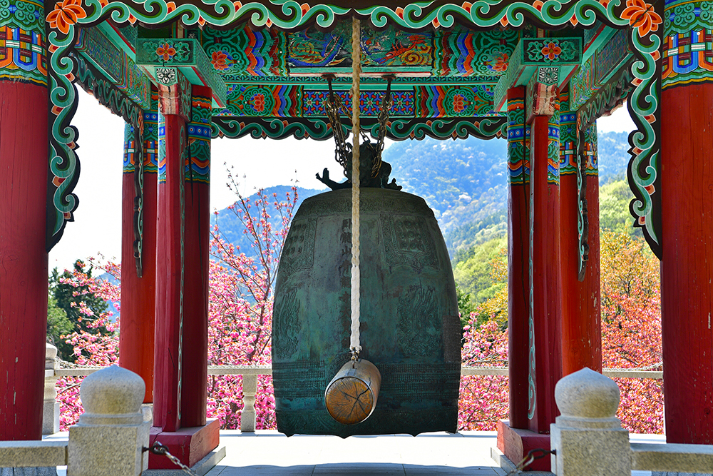 대웅전 맞은편의 범종각입니다. 진분홍빛 겹벚꽃과 대비되는 범종 모습에서 새로운 생명의 기운이 느껴집니다. 아마도 완연한 봄 기운 탓이겠죠?ㅎㅎ
