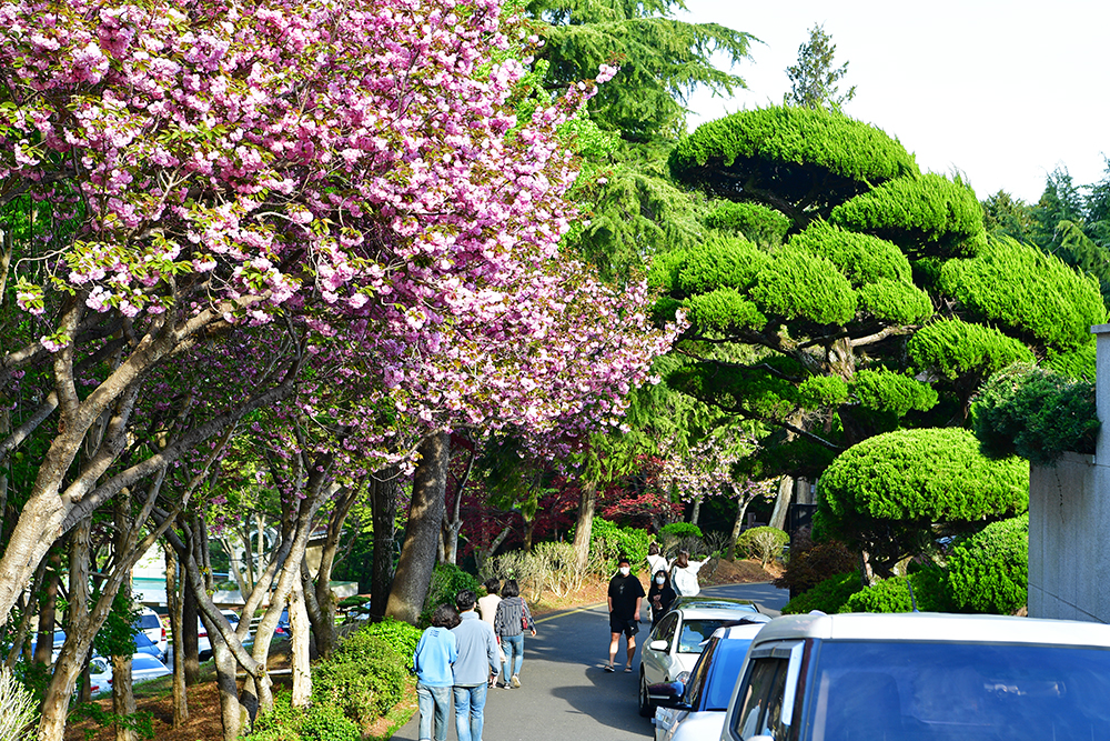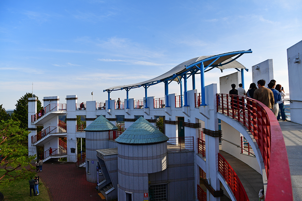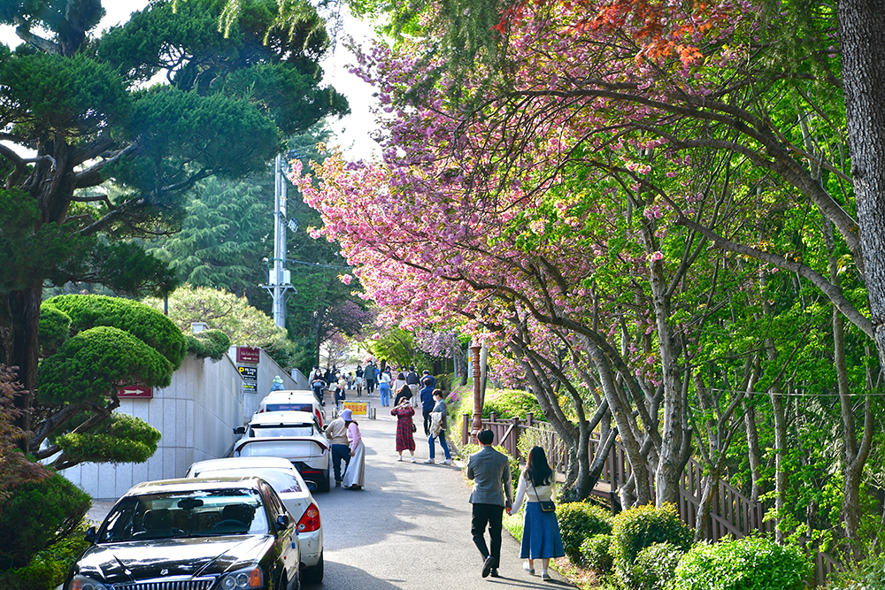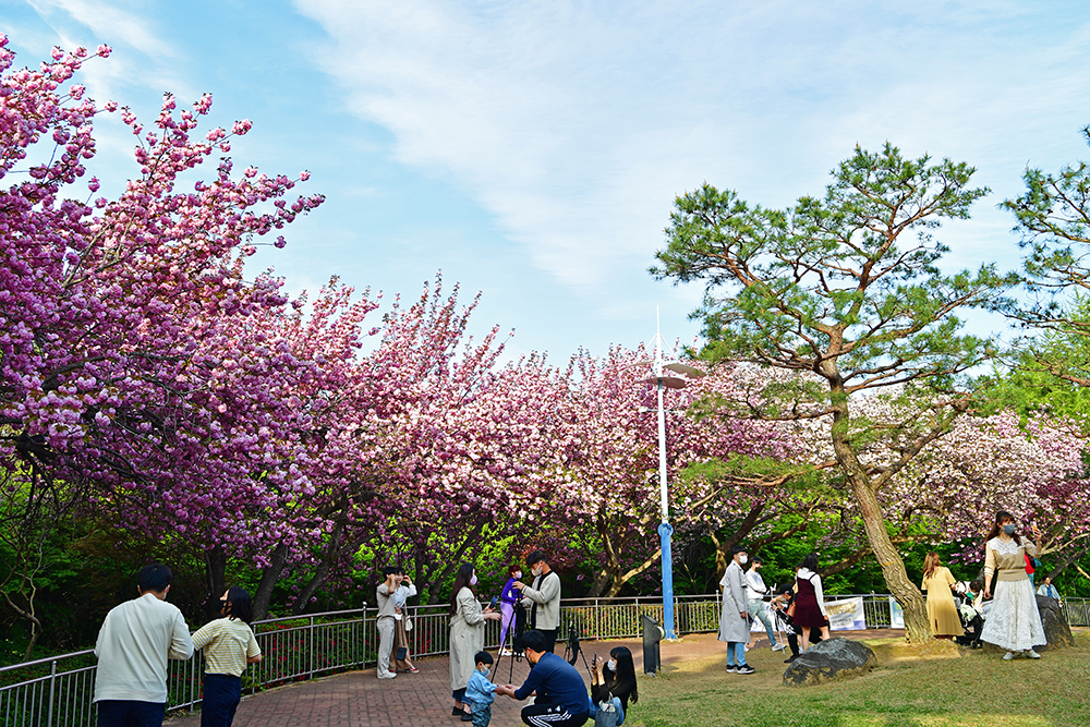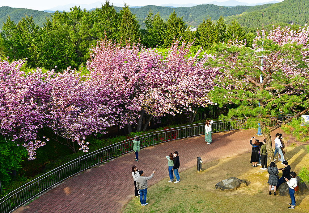 전망대에 도착했습니다. 전망대 앞 마당 주변으로 겹벚꽃이 활짝 입니다. 펜스가 있어 군락지 않으로 들어 갈 수 없지만 그 앞에서 사진을 찍으려는 사람들이 줄을 서고 있습니다. 그렇다면... 저희도... 줄을서야 겠죠?ㅎㅎ