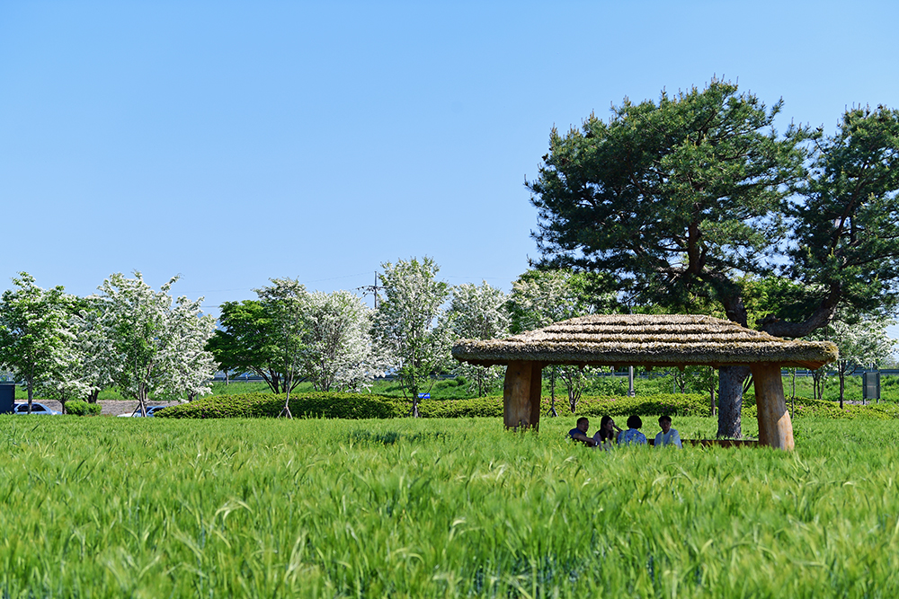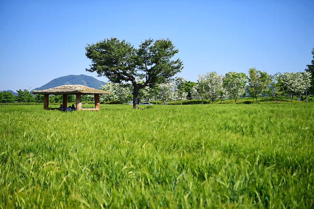 청보리 밭의 전경을 쓰윽 들러본 후, 지난해 봐뒀던 정자로 향했습니다. 정자 옆 큰 나무와 주변 풍경이 예쁘게 어우러진 곳입니다. 정겹운 정자와 어우러진 청보리밭의 모습을 살포시 담아 봅니다