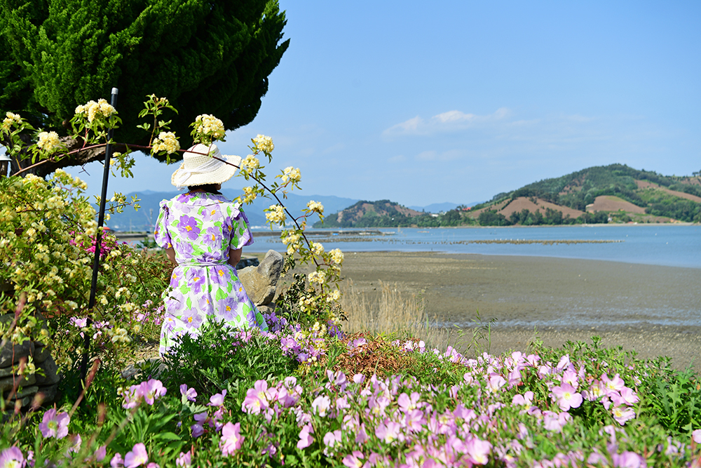 예쁜 포인터를 발견했습니다. 예쁜 꽃들과 함께 푸른 바다가 어우러지는 곳입니다. 썰물때로 갯벌도 찬조 출연을 해줍니다. 이곳에서 전속모델의 모습을 담아봅니다.ㅎㅎ
