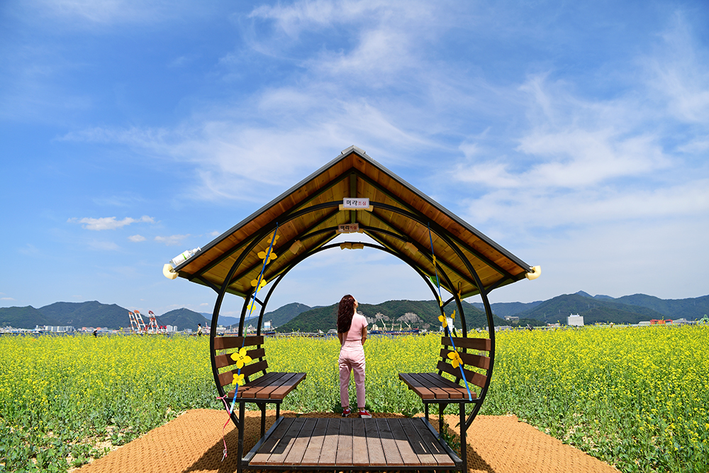 넓디 넓은 유채꽃 밭과 청보리 밭에는 예쁜 추억을 담을 수 있는 포토존이 있습니다. 뿐만아니라 따가운 햇볕을 피해갈 수 있는 예쁜 쉼터도 있습니다. 쉬엄쉬엄 걸으며 즐거운 시간을 가져 봅니다.ㅎㅎ