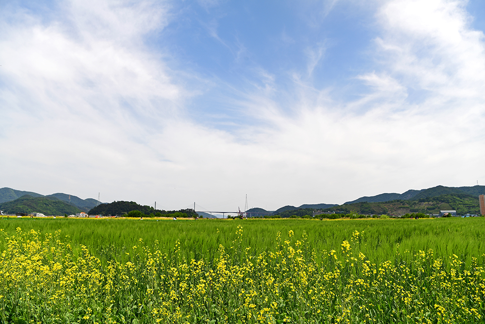 먼저 드넓게 펼쳐진 유채꽃 밭으로 발걸음 옮겨 봅니다. 푸른 하늘과 노란 유채꽃의 어우러짐이 정말 아름답습니다. 게다가 흰 구름의 출연은 아름다운 봄의 분위기를 더욱 업 시켜 줍니다.ㅎㅎ