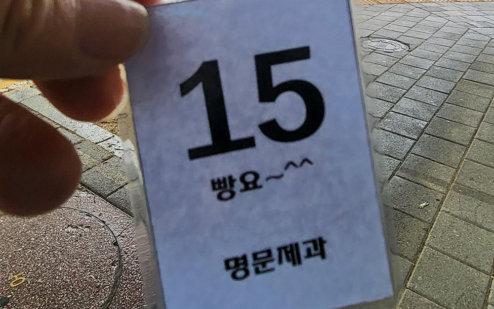 아내를 먼저 내려주고 저는 인근에 주차를 하고 왔습니다. 이번에도 어김없이 번호표가 배부되었습니다. 이번에는 15번이군요^^ 아시는 분들은 다 아시겠지만 이 번호표 순서대로 일정 수의 손님만 가게 안으로 안내합니다.