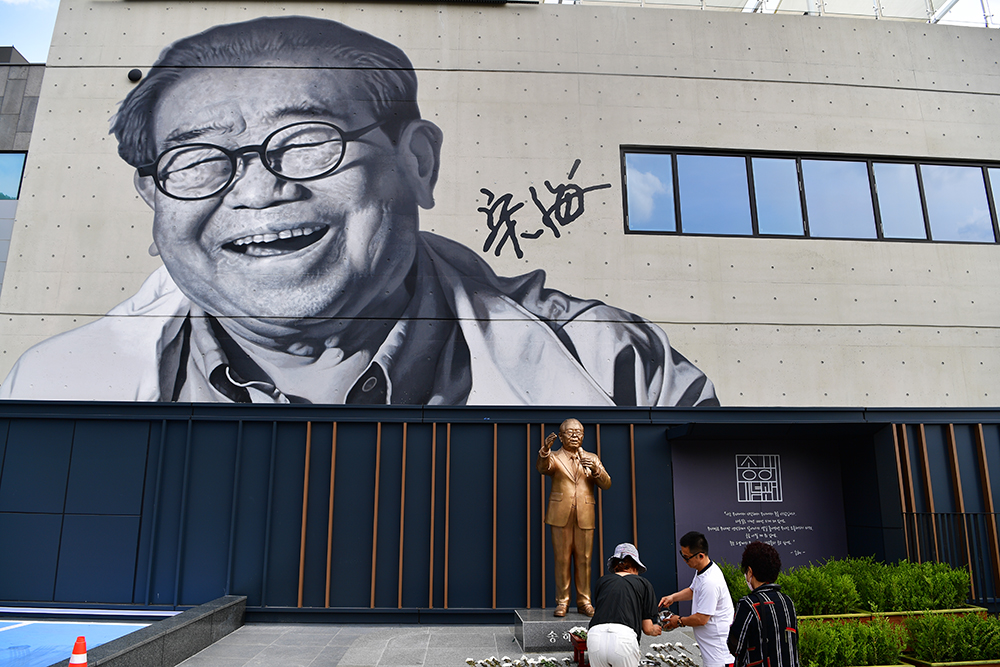 송해카페에서 휴식을 취한후 기념관을 나왔습니다. 입구 벽면에 송해선생의 대형 그림과 동상이 있는데, 여기서 선생을 추모하는 헌화를 할 수 있습니다. 저도 국화 한송이와 막걸리 한잔을 올리며 선생님의 안식을 기원했습니다.