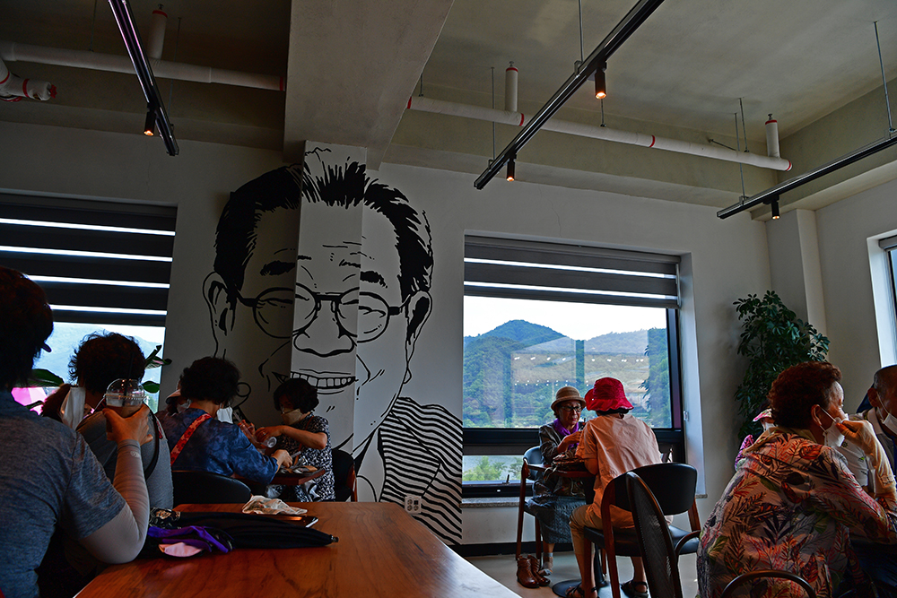 주문한 음료의 컵홀더를 보니 '백세기원'이란 문구와 함께 송해 선생님 캐릭터에 있습니다. 모든 것이 송해 선생님으로 연결되는 송해기념관 답습니다. 창 밖을 보니 주자창에 있는 전국노래자랑 무대에서 즐거운 시간을 보내는 방문객의 모습이 보입니다. ㅎㅎ