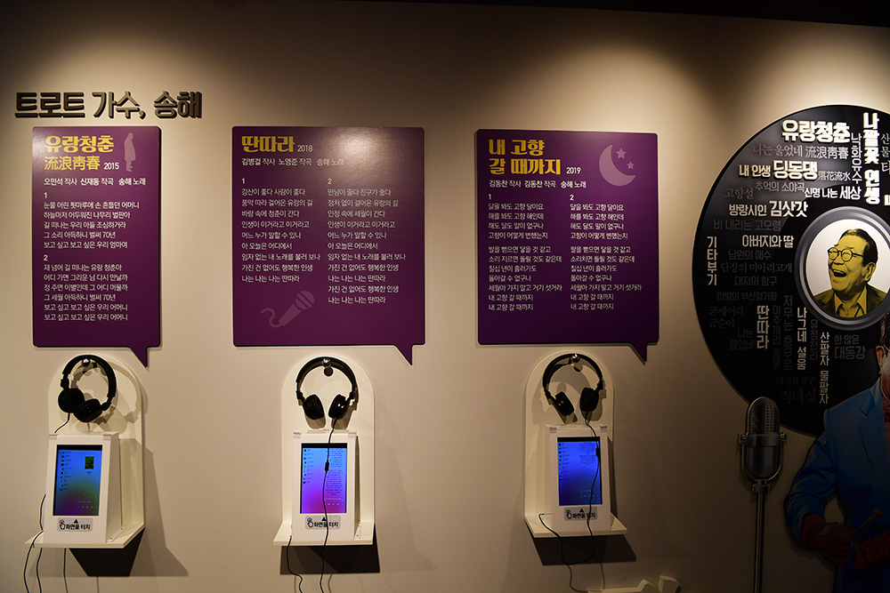 2층에는 송해기념관 답게 송해의 발자취, 라디어스타 송해, 트로트가수 송해등 다양한 이야기로 구성되어 있습니다. 그 중 ‘전국노래자랑에피소드 관'에 관람객이 많습니다. 화면속에서는 어린 소녀가 아버지를 그리는 노래를 애절하게 부르자, 송해 선생님이 2절을 구슬프게 부르는 모습에서 코끝이 찡했습니다. ㅜㅜ